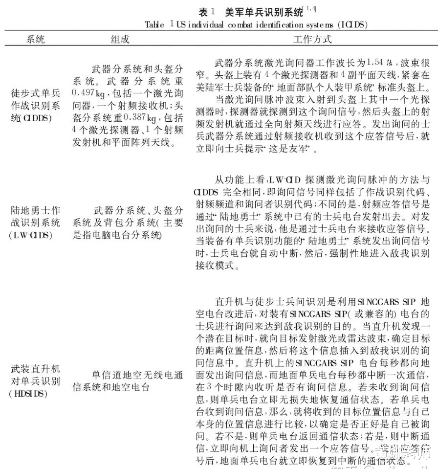 比如,目前美军主要的以下这三个系统——徒步式单兵作战识别系统(CIDDS)、陆地勇士作战识别系统(LW-CIDS)、武装直升机对单兵识别(HDSIDS)。