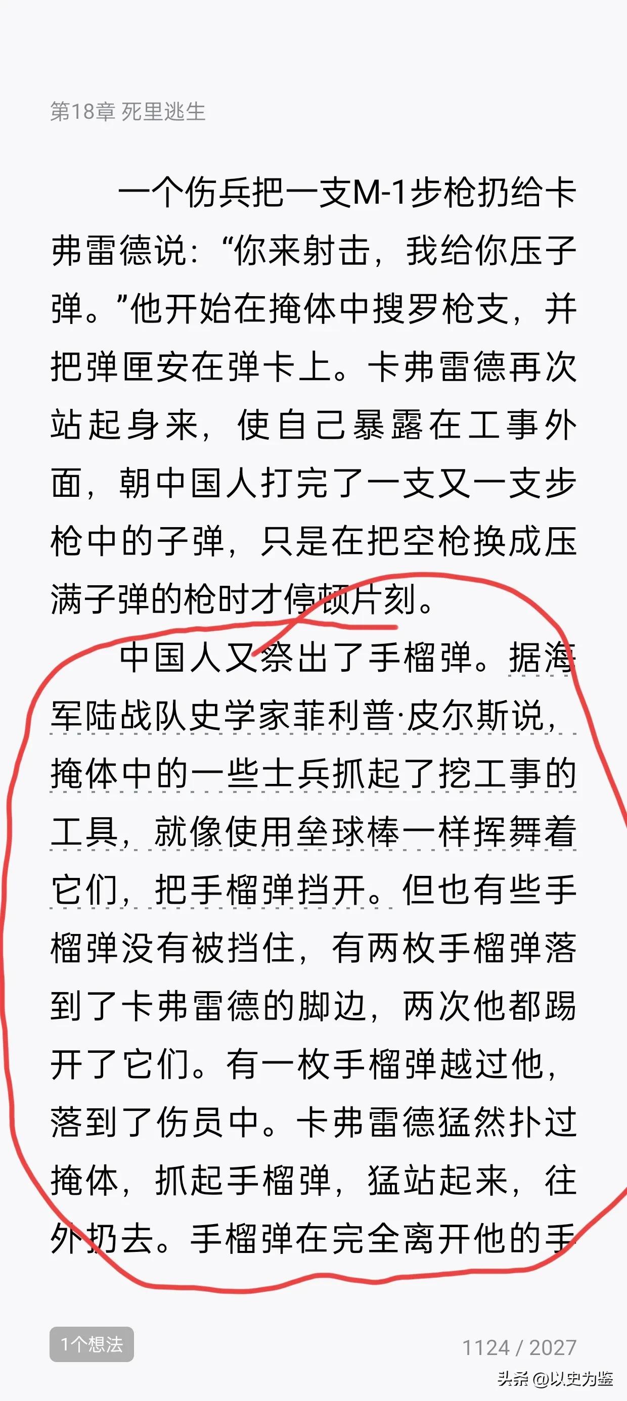 给大家看看美国人怎么吹长津湖的:面对志愿军的手榴弹攻势,美国大兵挥舞挖工事的工具,就像使用垒球棒一样挥舞着它们,把手榴弹挡开…… 这个描述和某些抗日神剧非常相似了,但是抗日神剧大家都知道是假的,而上述美国大兵用工具像打垒球一样打出志愿军的手榴弹则是美国著名军史专家说的。 在美国人写的《未曾透露的真相》一书里,海军陆战队史学家菲利普·皮尔斯在描述陆战一师在长津湖之战撤退时说: “面对志愿军的手榴弹攻势,藏在掩体中的一些士兵抓起了挖工事的工具,就像使用垒球棒一样挥舞着它们,把手榴弹挡开。 但也有些手榴弹没有被挡住,有两枚手榴弹落到了卡弗雷德的脚边,两次他都踢开了它们。 有一枚手榴弹越过他,落到了伤员中。卡弗雷德猛然扑过掩体,抓起手榴弹,猛站起来,往外扔去。手榴弹在完全离开他的手指之前爆炸了,他的手掌被弹片削下一块块肉,一根断指飞落在地上。” 大家看看,用工具打飞手榴弹、有两枚漏下的直接用脚踢开、有一枚投得太远还能被捡起来仍远…… 要是一两次还真有可能,但是一个士兵连续打飞/踢飞/捡起手榴弹扔掉……最后只伤到一根手指…… 请问这样的可能性有多大?美国人的记载水分也忒大了[抠鼻]