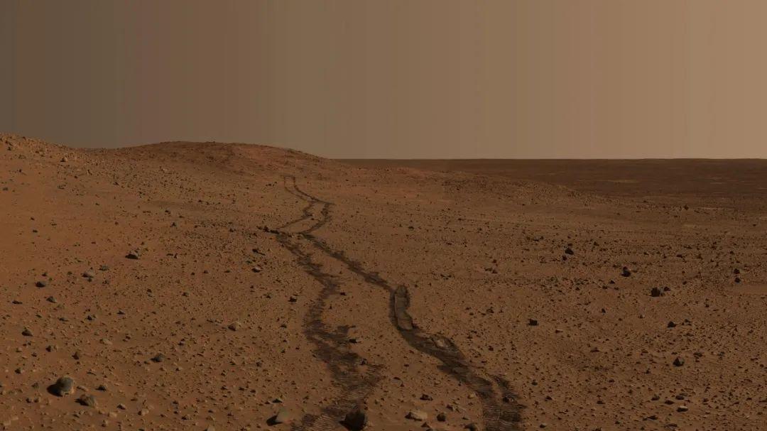 勇气号火星车拍摄的火星表面。荒芜的火星表面留下了机遇号火星车的车辙。NASA
