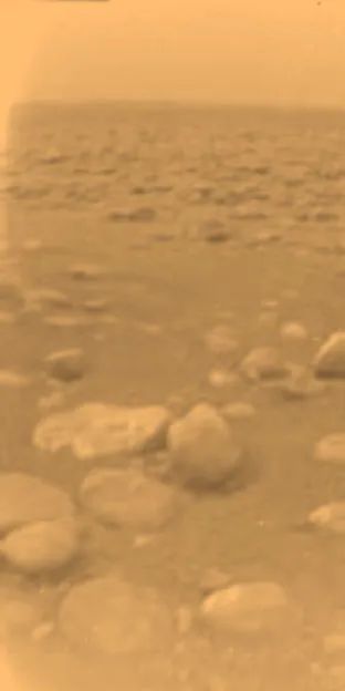 这是惠更斯探测器着陆后拍摄的土卫六表面照片。我们可以看到惠更斯的着陆点有大量卵石,表明它们可能长期经受了液态物质(甲烷)的冲刷。惠更斯的着陆点可能是一处干涸的河床。