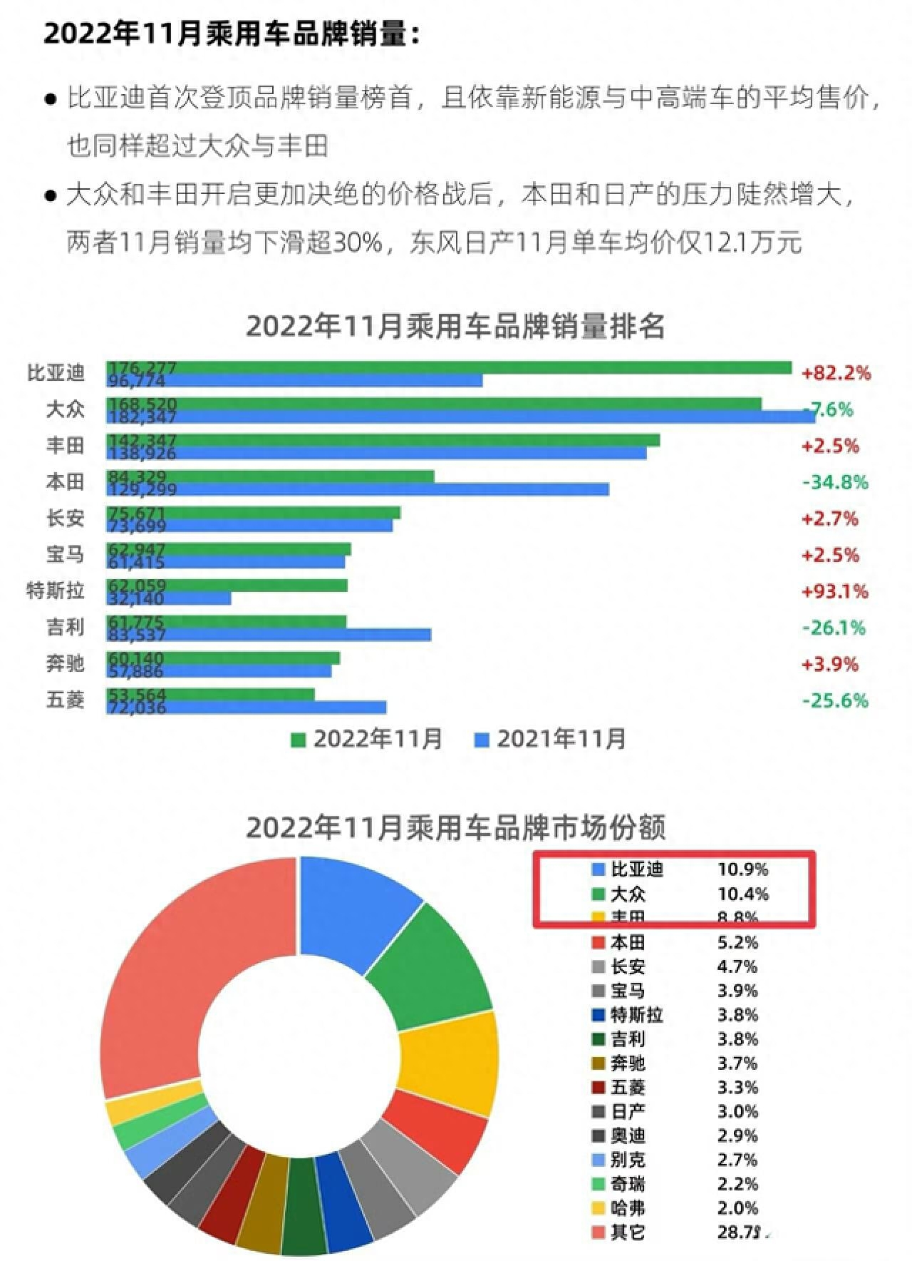 在2022年11月,根据国内上险数量统计,比亚迪汽车的月度销量为176277辆,这是比亚迪第一次超越丰田和大众,在中国乘用车市场获得单一品牌的销量冠军,这件事距离比亚迪宣布停产燃油车,生产新能源仅仅过了9个月,这说明了比亚迪在新能源领域的超前地位,也是新能源超过燃油车的首次突破,更是第一次超越的全市场所有的乘用车品牌。这就是比亚迪所走过的第一个里程碑!