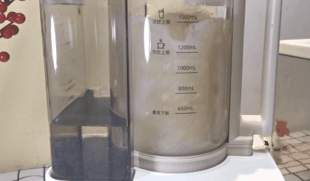 ▲▲因为家里人较多,以制作1000ML的浓豆浆为例,直接将水箱的水接至2000ML的最高档位,超大容量的水箱可以保证完成哪怕最高1200ML的热饮后,仍有足够的清水来执行清洁功能,清理杯体。