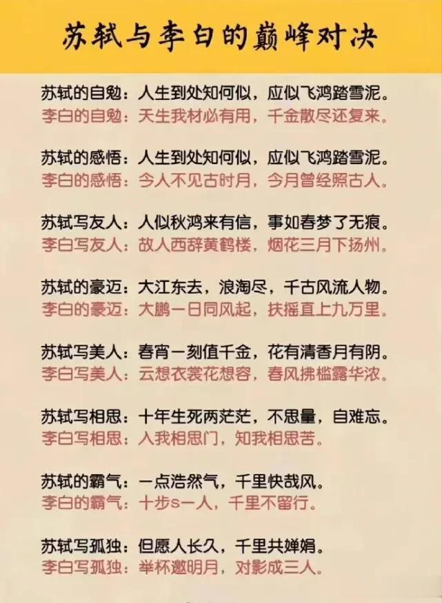 苏轼与李白的巅峰对决: 苏轼的自勉: 人生到处知何似,应似飞鸿踏雪泥。 李白的自勉: 天生我材必有用,千金散尽还复来。 苏轼的感悟: 人生到处知何似,应似飞鸿踏雪泥。 李白的感悟: 今人不见古时月,今月曾经照古人。 苏轼写友人: 人似秋鸿来有信,事如春梦了无痕。 李白写友人: 故人西辞黄鹤楼,烟花三月下扬州。 苏轼的豪迈: 大江东去,浪淘尽,千古风流人物。 李白的豪迈: 大鹏一日同风起,扶摇直上九万里。 苏轼写美人: 春宵一刻值千金,花有清香月有阴。 李白写美人: 云想衣裳花想容,春风拂槛露华浓。 苏轼写相思: 十年生死两茫茫,不思量,自难忘。 李白写相思: 入我相思门,知我相思苦。 苏轼的霸气: 一点浩然气,千里快哉风。 李白的霸气: 十步杀一人,千里不留行。 苏轼写孤独: 但愿人长久,千里共婵娟。 李白写孤独: 举杯邀明月,对影成三人。 我觉得在诗方面,李白比苏轼更胜一筹。 除诗之外的文学方面,苏轼比李白强很多。 双方各有千秋。