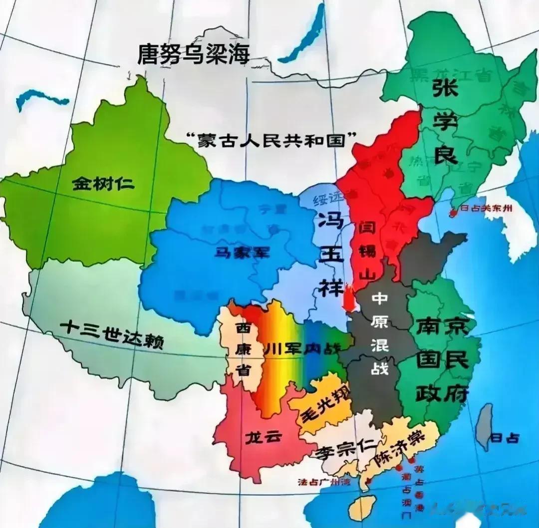 大清灭亡之后,天下大局开始了剧变。 基本都是军阀混战,割据天下。 民国政府只是偏安东南一隅。 东北有张作霖张学良父子。 北京山西这边有阎锡山和冯玉祥。 再往西边有马家军。 新疆有金树仁。 西藏有达赖。 西南和南边就非常复杂了。 李宗仁,陈济棠,龙云,毛光翔等。 当然后面是蒋介石取得了临时国民政府,紧跟着日军侵华,国共一起抗日。 后面又是三年解放战争,最终新中国成立。