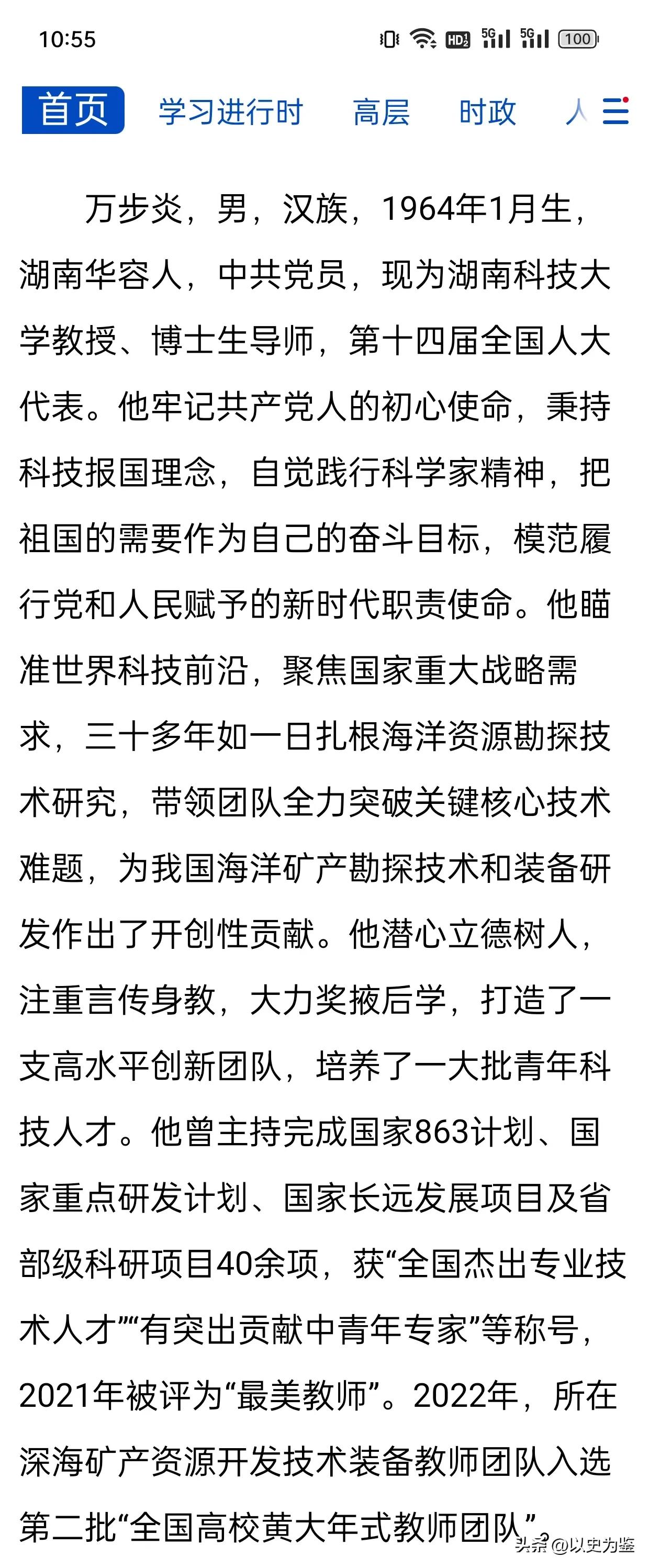 收到一条群发短信,简单查了一下,感叹能评上时代楷模的真的都是人中龙凤。 万步炎教授的外祖父是红军烈士,他是听着红军故事长大的。 1978年,14岁的万步炎因为才学出众提前参加高考,填报的志愿全是航空航天和天文学。然而,他被调剂到中南矿冶学院地质系探矿工程专业,7年后服从分配到长沙矿山研究院工作。 当时海洋采矿是一个全新的课题,而且海洋矿藏对我国非常重要,有人说:“深海勘探技术有多强,我们的国家就能走多远。” 当时长沙矿山研究院组建海洋采矿研究室,1990年,中国大洋协会成立。万步炎所在的团队,开始正式接触海洋采矿系统研究任务。 1992年,万步炎远赴日本,学习日本的海洋采矿扬矿技术经验。一年后,他婉拒高薪工作,毅然回国。 1992年的中国人均GDP仅366美元,海洋采矿设备小到样品管,大到取样器、绞车……全是高价买来的外国货。 万步炎就带着团队硬啃这块硬骨头。直到2003年夏天,中国首台深海浅地层岩芯取样钻机海试成功,在海底下钻0.7米,并取回矿石样本。这是中国的海底钻机在海底钻到第一个孔! 随后,0.7米、2米、5米、20米、60米……“海牛家族”没有停下深海开垦的脚步。 2021年4月7日,中国首台“海牛Ⅱ号”海底大孔深保压取芯钻机系统在海底成功下钻231米,刷新世界纪录。 而且关键技术完全自主研发、150余项国家专利、16项国际发明专利,“海牛Ⅱ号”的成功意味着,我国海底矿产资源探采装备技术已基本满足了海洋资源的勘探需求…… 不愧是国之脊梁,时代楷模!