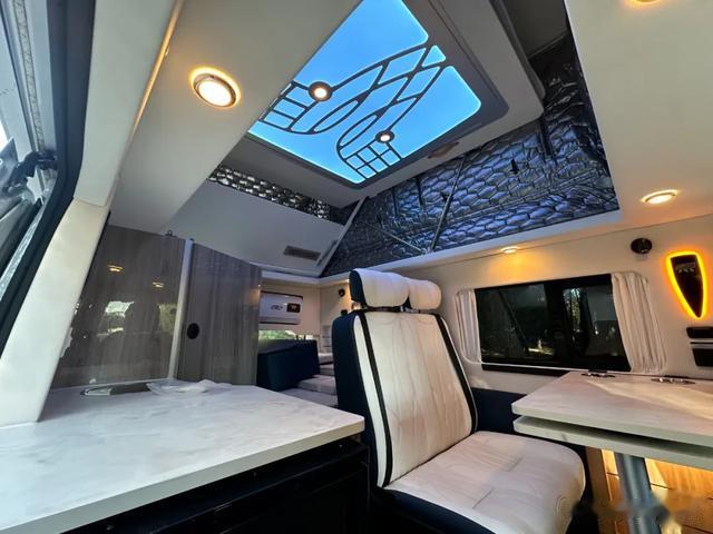 进入车内生活区,虽然空间不大,内部高度1米4,成年人无法站立,但日常乘坐宽敞舒适。偏Vanlife风格的设计,细节与家具做工精细,毫无毛边瑕疵。车顶条形造型搭配质感覆盖件,高级又不失格调。