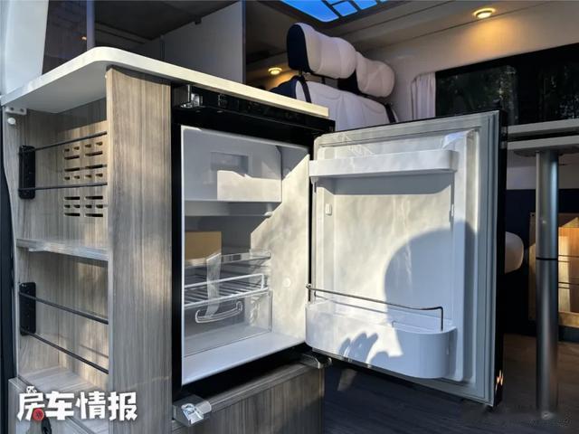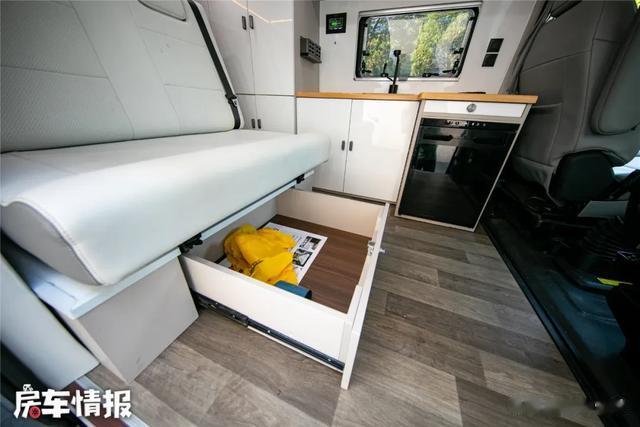 车内布局合理,厨房组柜与大量储物柜分布在车厢内侧。厨房操作平台大,水槽、冰箱一应俱全,烧水、煮咖啡轻松搞定,外侧抽拉桌板还能随时拓展空间。客厅的双人座椅宽大舒适,带电动调节,放平后秒变双人床,拼床超简单。车厢后尾门上掀式设计,打开后可赏景、钓鱼;左侧柜子有外置淋浴花洒,车尾加遮阳帘就能洗澡。工厂还对车尾升级,增加储物空间与抽拉桌板。