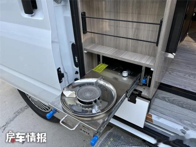 侧滑门旁厨房侧柜,没做饭需求是储物柜,有需求可按需选装电磁炉、冰箱等,个人推荐选冰箱,做饭用卡式炉就行。车厢后方还有独立卫生间,虽小但能洗漱,自备便携式马桶也能解决如厕问题。