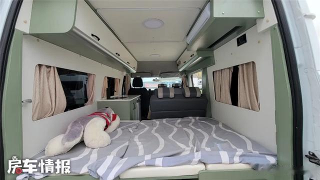车内空间虽不算大,但满足两人使用绰绰有余,比宿营车宽敞许多。隐藏式卫生间设计让它看起来更像宿营车。车内有两张床,车尾横置床可睡一大一小;前方隐藏沙发床通过翻折副驾驶和后排双人座椅,能拼成1米9的单人床,高个子也能舒适安睡。