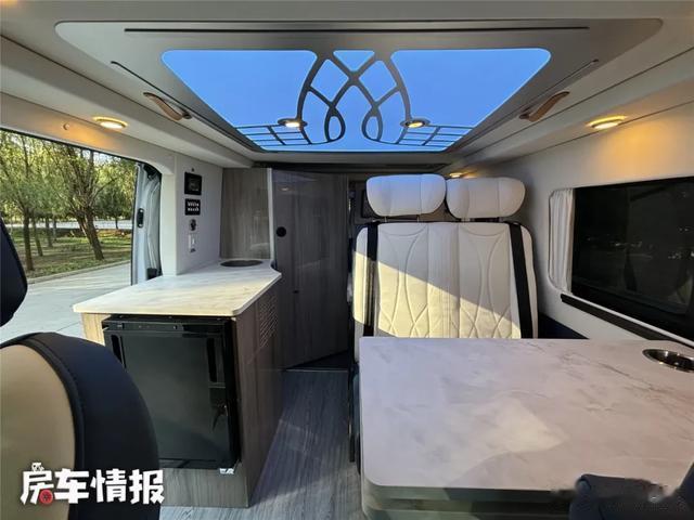 标配的电动升降顶拓展了内部空间。行车时收起,驻车后遥控器或机械开关一按就能打开,生活区垂直高度能达1米9,大高个也能站直。还能选装车顶双人床,有睡眠需求更方便,不选装,打开升顶也能直接站立,这可是同价位竞品没有的功能,让它稳稳成为“旅居车”,而非空间压抑的“宿营车”。