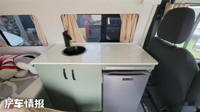 车厢内侧是简单实用的厨房操作台,洗菜池、冰箱、储物柜一应俱全,做饭可自备卡式炉或电磁炉,车内车外都能操作。上方储物吊柜方便收纳,中顶底盘让1米6左右的人也能轻松拿取物品。别看它空间小、价格低,车内还做了隔音保温处理,舒适度直线上升。
