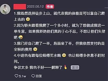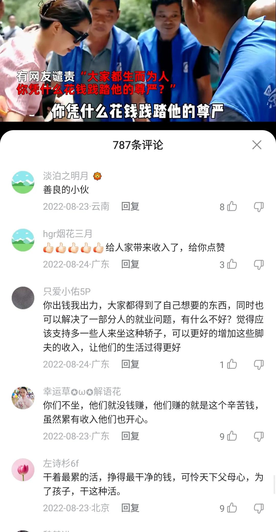 冯玉祥将军曾经见不得人力车夫拉车的辛苦,曾下令不许让坐人力车,后来他微服私访,听见车夫都在骂他,才知道自己错了,取消了禁令,并带头坐车。 而如今有些网友总爱站在道德的制高点去绑架别人,上山抬轿子的轿夫也是为了工作挣钱养家,结果一些网友就是以自己的“高尚品质”去评价别人,认为坐轿子上山就是对轿夫的不尊重,那你可曾想过,这样你会砸了轿夫的工作,他们也有家庭需要照顾。 正如一位网友的评价很中肯:虽然说别人抬你感觉很不好,但是这也是一种职业,对于这些没有学历,没有技能的人来说,这也是他们养家糊口最好的方式,对他们最好的尊重,就是不要无脑的去评价