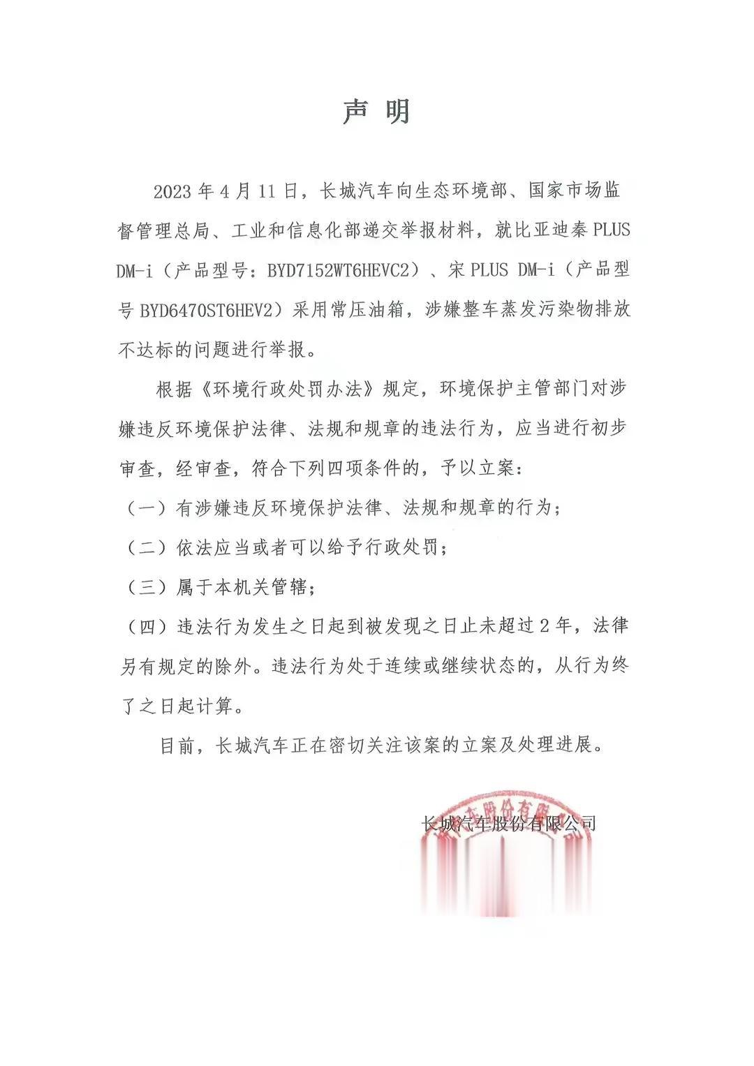 车圈又出事了,比亚迪今天下午正要发布新车,长城汽车在上午直接发布声明称向有关部门举报比亚迪某型号汽车不达标,污染环境。 看完长城的举报信,虽然说长城举报污染环境的做法是对的,但是总的来说一个是由长城去举报竞争对手,另一个是还选择在对方即将召开新车发布会的时间点上,总体上还是显得格局有点小了 要知道当年长城要搞魏派的时候,比亚迪可是直接把注册的魏商标无偿赠送给了长城的 而且下午的时候,比亚迪也发布声明,说长城自己购买车辆,自己送去测试不符合第三方检测的规则…… 估计这事在接下来的几天里都会是车圈的一大话题,不知道你怎么看?