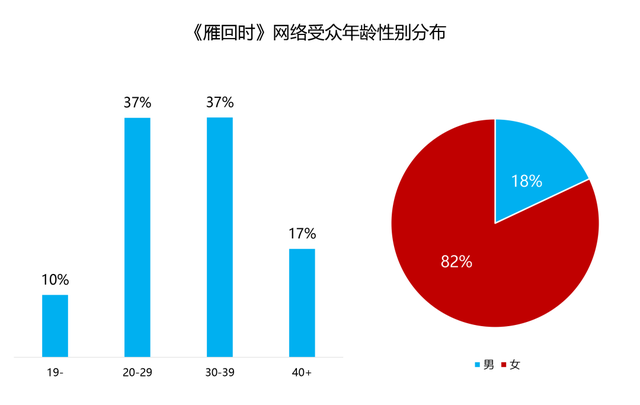 下图为该剧受众属性,年龄在20-39之间的年轻用户占比高达74%,女性用户比例则为82%,可见该剧深度触达女频核心受众。经过多年内容深耕,腾讯视频积淀下庞大的女性优质用户,包括《雁回时》在内的优质女频内容,是平台通过持续提供高品质作品满足女性用户需求,保持用户对平台满意度的有效尝试。