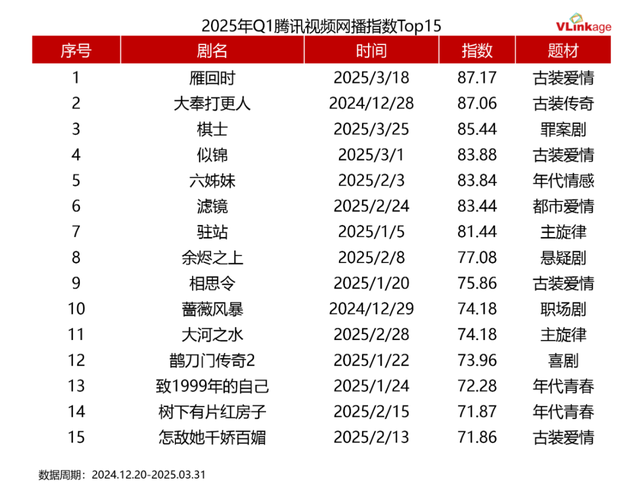 今年Q1的剧集市场,各赛道充满活力。以《六姊妹》为代表的合家欢作品在台网掀起追剧热潮,以《雁回时》和《棋士》为代表的诚意之作,则分别在女性受众和男性受众里获得优异反馈。在这些风格多元的作品背后,以腾讯视频为代表的视频平台,正在用差异化的内容布局,构建起长视频领域的内容护城河。