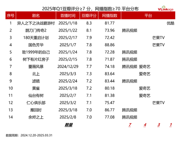 下图为2025年Q1豆瓣评分在7分以上,且网播指数在70+的剧集盘点,这14部兼具口碑与热度的剧集,代表着今年剧集市场观众的最新审美取向。从平台分布来看,腾讯视频包揽了其中7部,数量占比达到50%。由此可见,今年Q1腾讯视频在精品剧方面,也迎来大丰收。