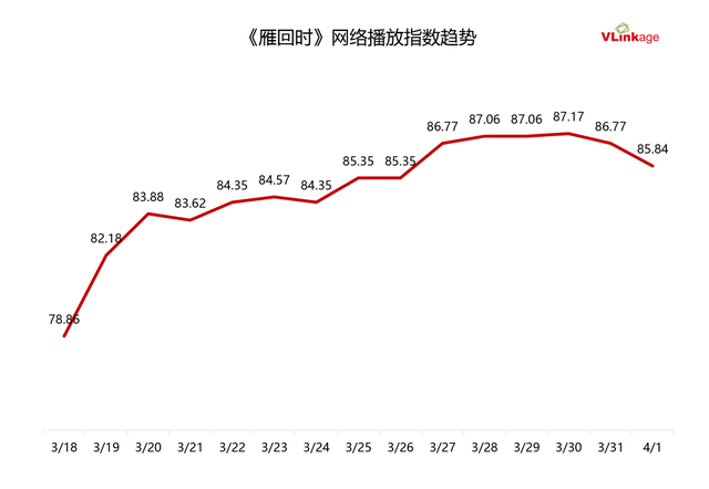 《雁回时》是平台用优质内容维持用户忠诚度的又一典型案例。这部作品在腾讯视频上线以后,用引人入胜的内容不断拓展受众群体,热度持续走高,并稳定保持在85+的热度高位。
