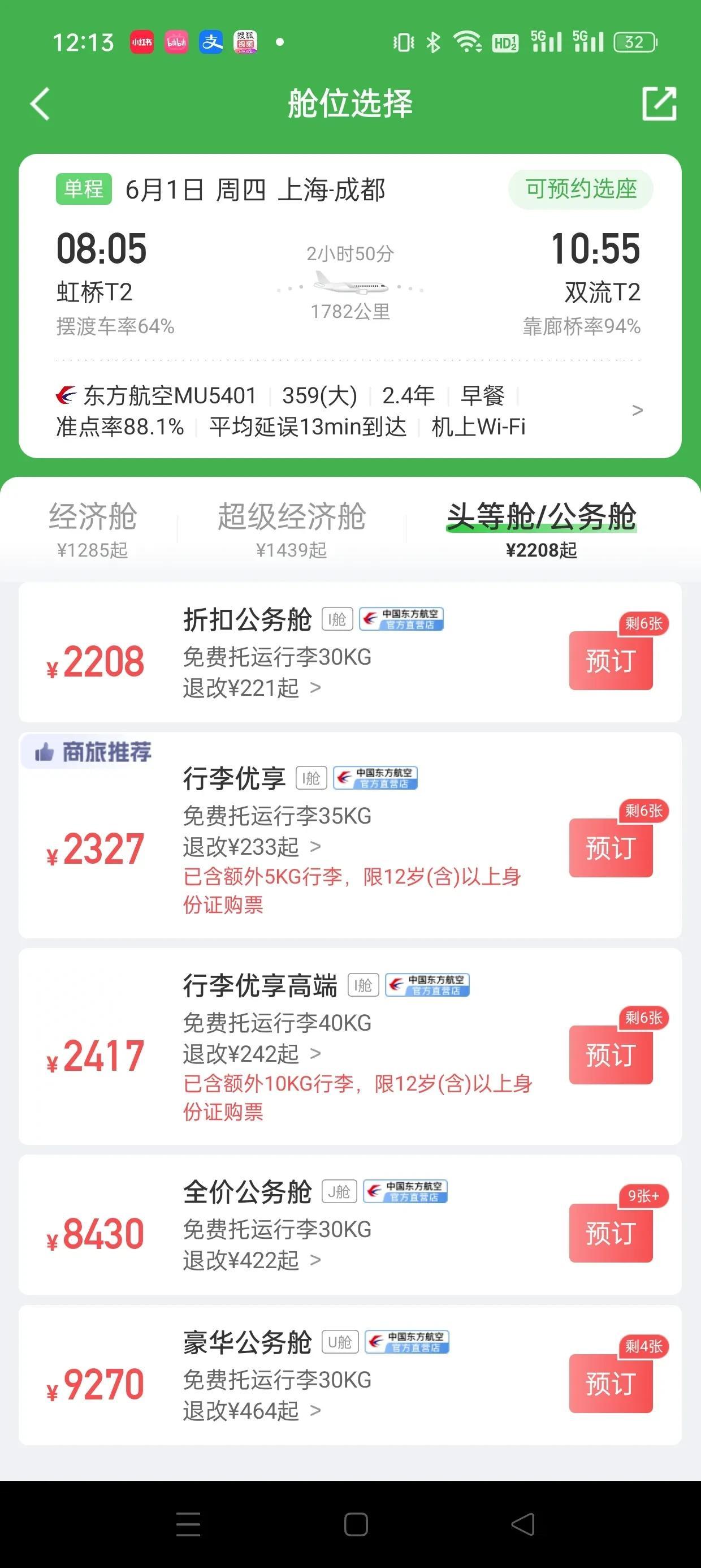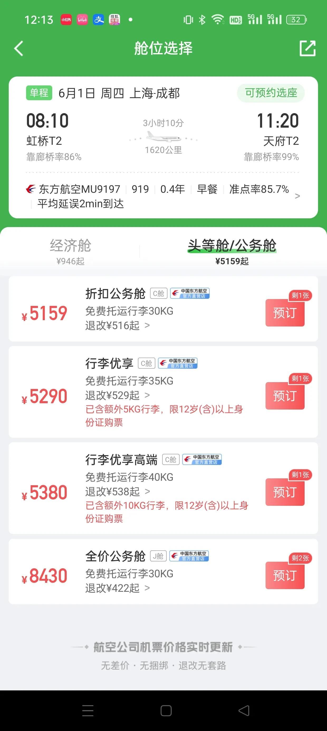 国产大飞机C919刚刚首飞,果然就有大V坐不住,出来胡说八道了! 这个粉丝一百多万的博主直接说:“C919航班价格太贵。经济舱2000,头等舱8000,每分钟45块,普通工薪阶层真的消费不起……” 要是不仔细思考,还真有人信了他的邪了。 首先我们问一下:“哪个工薪阶层出差会去买头等舱?”单位出差都有报销标准,自己出去玩可以根据自己实力自由选择机舱。为何单单要突出“工薪阶层买不起头等舱”这一个诡异的话题? 再说票价,但凡登录一个机票APP查一下价格就不会这么胡说八道了。我随便查了一下同样是上海到成都的机票。 图二是30日上海飞成都的票价,东航C919经济舱票价1100;和东航空客机型票价一致。 再看一下6月1日上海飞成都的头等舱。东航执飞的C919仅剩1张票,价格五千多,八千多的是全价公务舱。 而同一天,东航也是飞成都的空客359机型的头等舱剩的票多一些,价格也便宜,只要两千多,的确比C919便宜。 但是我们往下看看,看到全价公务舱了吧,就是该博主说的919八千多的价格,为啥空客价格也是八千多呢? 这还是C919首航,所以一票难求,所以价格肯定会偏高一些。等到执飞C919的航线、航班都更多了。国产大飞机的优势出来了,价格肯定会降下来。 到时候再看这些说“全价头等舱八千多的价格说普通工薪阶层买不起919票的人”…… 只能说呵呵哒!
