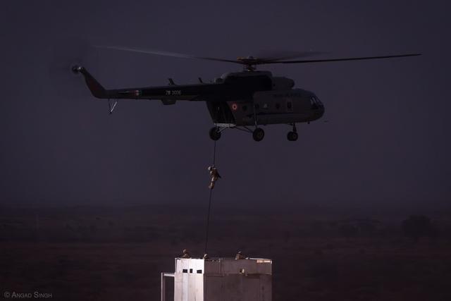 印度空军特种部队(“Garuds”)从米-17上快速索降进行建筑干预演示