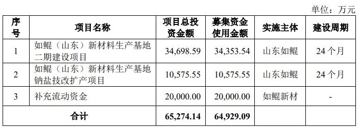 如鲲新材原计划募资6.5亿元,其中,3.44亿元用于如鲲(山东)新材料生产基地二期建设项目,1.06亿元用于如鲲(山东)新材料生产基地钠盐技改扩产项目,2亿元用于补充流动资金。