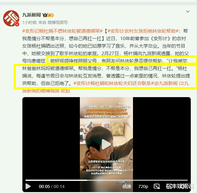 据悉,杨杜鹃目前除了照顾父母之外,剩余的时间便是借助自媒体的力量打造属于自己的一片天地。
