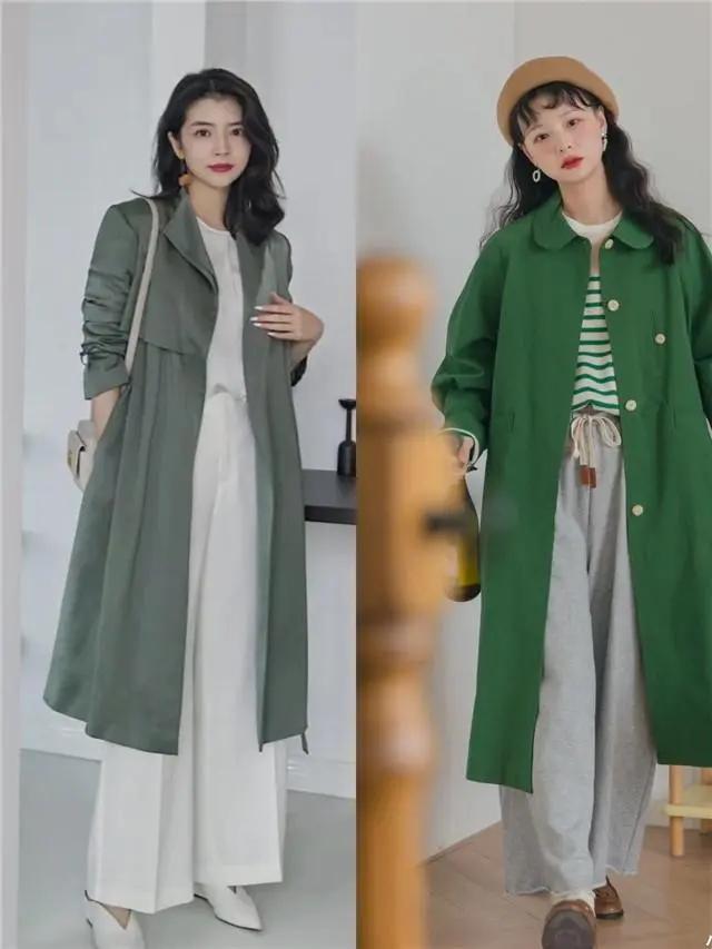 豆绿色风衣拥有接近大自然色彩的视觉享受,它摒弃了常见的鲜艳绿色,转而选择了更加内敛和谐的色调。这种颜色能轻松营造出春日的氛围感,透露出生命力与朝气。同时,豆绿色的风衣适合喜爱自然风格、追求平衡与和谐的中年女性,可以说是春日穿搭的绝佳选择。