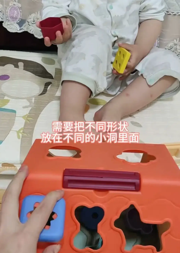 事情是这样的,妈妈陪孩子在玩玩具,这个玩具是选择对应的形状的方块,放进对应的空格子里,就算成功,主要是用来训练孩子手眼脑协调能力的。