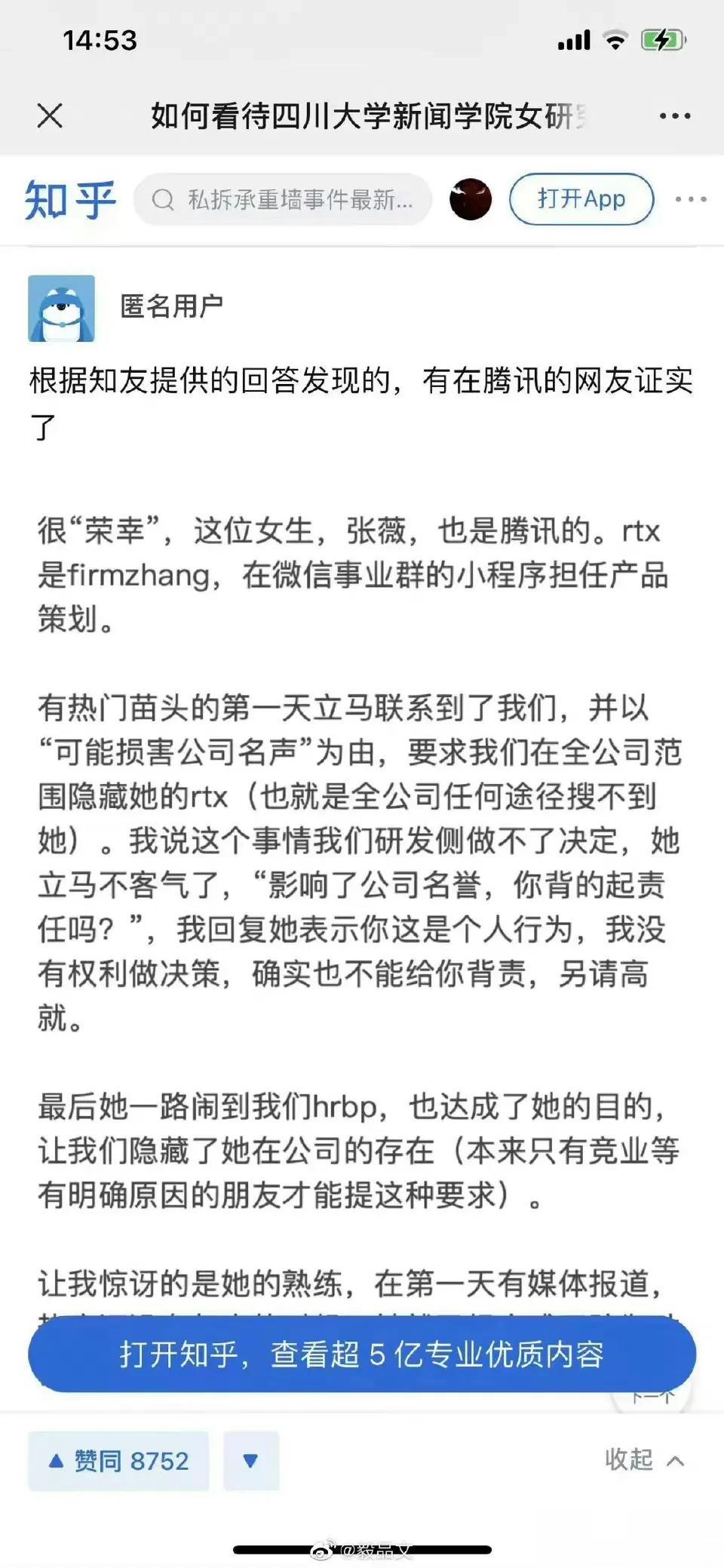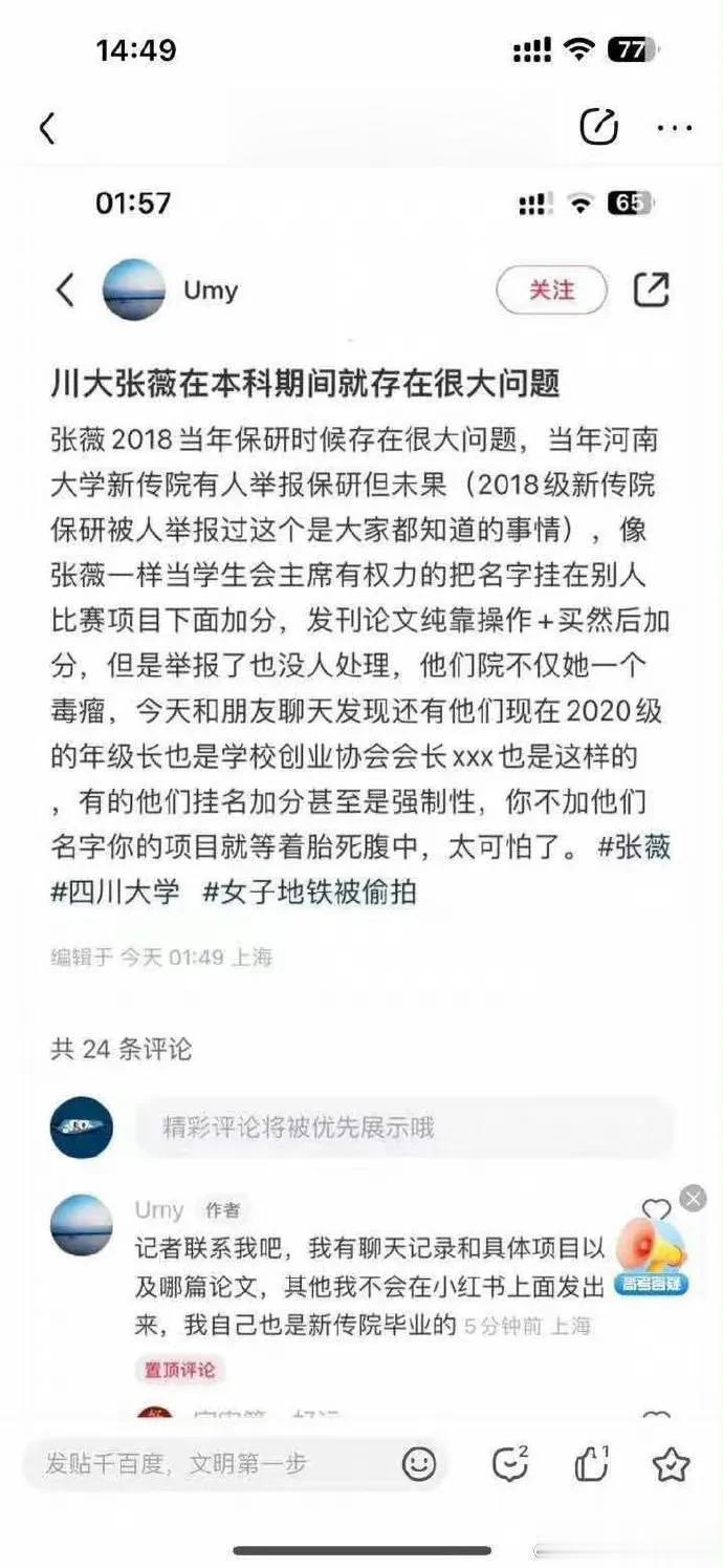 广州地铁诬陷大叔偷拍的张同学又被扒出其他问题了。张同学本科是学生会主席,一般学生会的干部都能优先入党,张同学入党应该是这一时期; 网上爆出张同学保研靠的是名字挂靠别人论文,这个不知道真假,如果形成舆情,河南大学也应该回应一下,不过貌似爆料的小hs账号已经没了…… 张同学保送川大,现在刚研一就跑到腾讯实习,看来川大还没来得及好好教育一下张同学,结果就出事了。如此看来,网友都在骂川大,川大实属有点冤……[吐舌] 上面这些还可以理解,唯独爆出来张同学在腾讯的操作我个人是十分佩服的。 我这样的职场老油条都不一定能够想起让公司屏蔽我的微信号,一个实习生在事件发生后第一时间就能闹到hrbp,还得逞,如果这事是真的,张同学绝对是拥有顶级的传媒嗅觉。 可惜,张同学这么优秀的传媒人才,屁股却没有坐到人民这边……