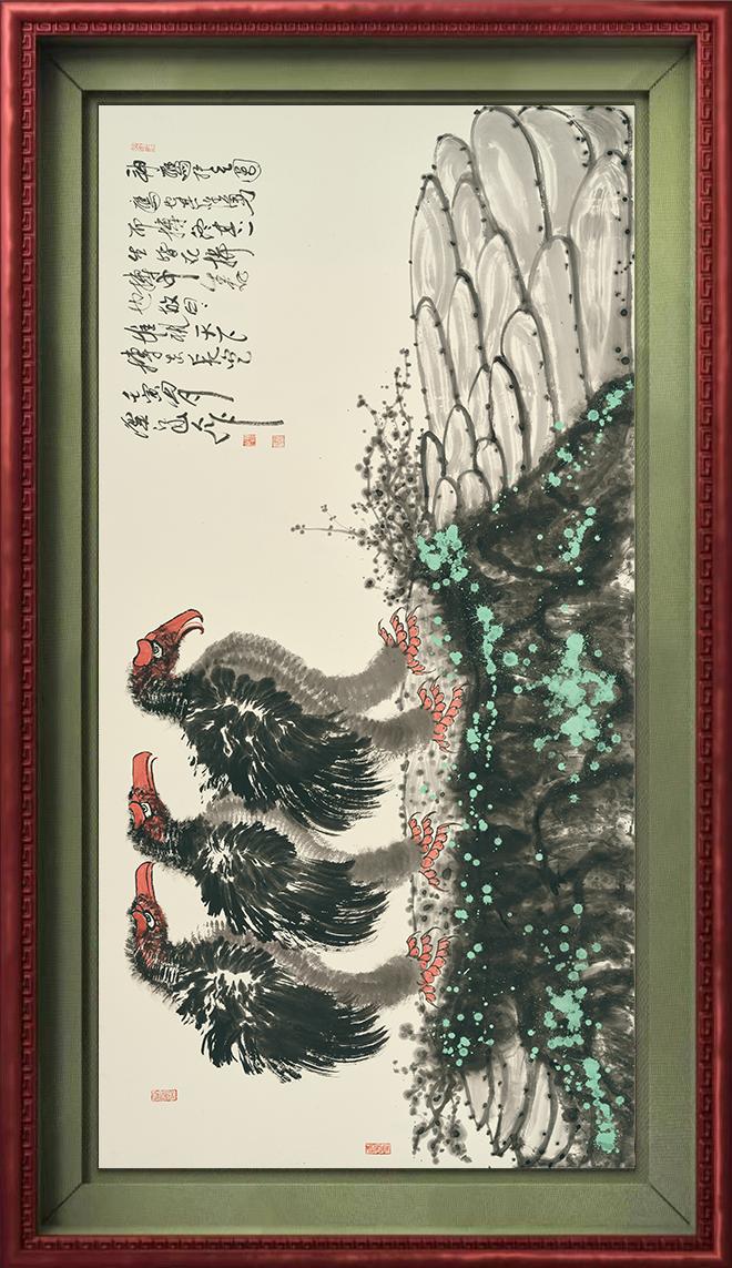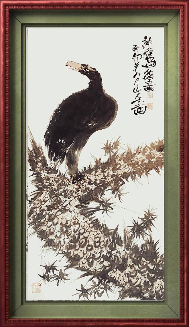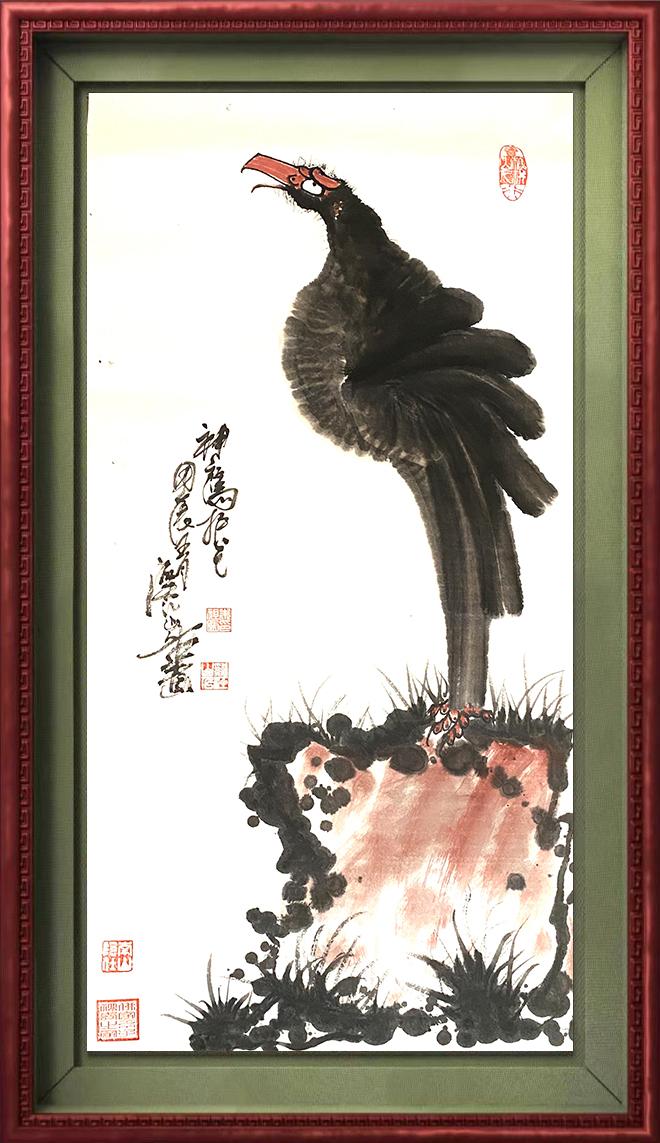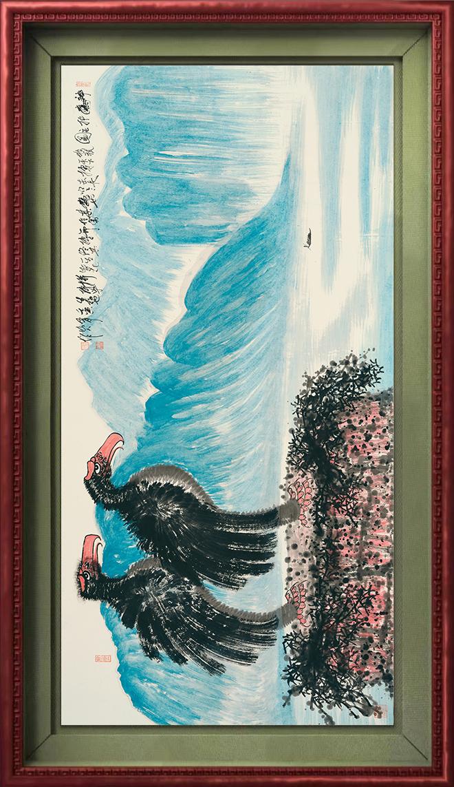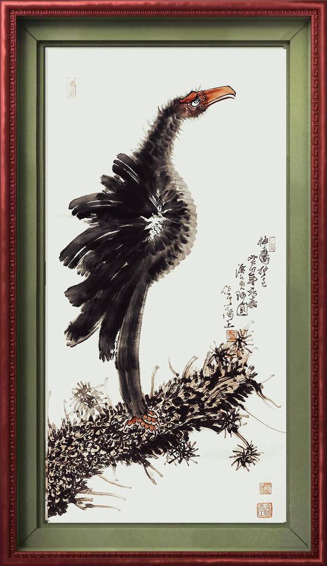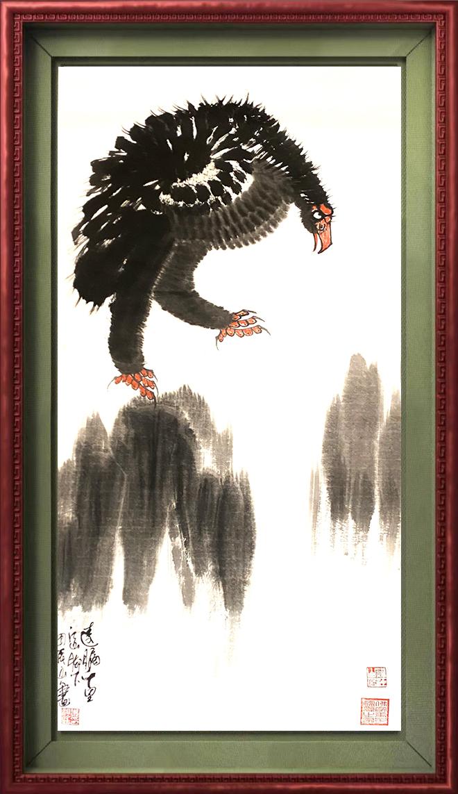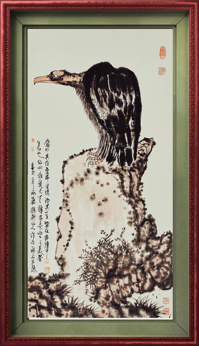 朱祖国笔下雄鹰不但形态健美,英姿勃发,气韵贯虹,而且在笔墨的枯湿浓淡和作画的宽阔胸襟中,脱去了鹰的凶气,融入了雅气,更显豪气、义气、文气。他以书法入画,再根据不同的画面配上自己创作的诗文,构成了风格鲜明,独具特色的雄鹰题材,在画坛独树一帜。