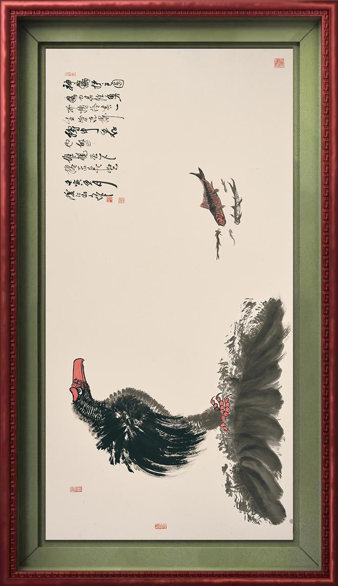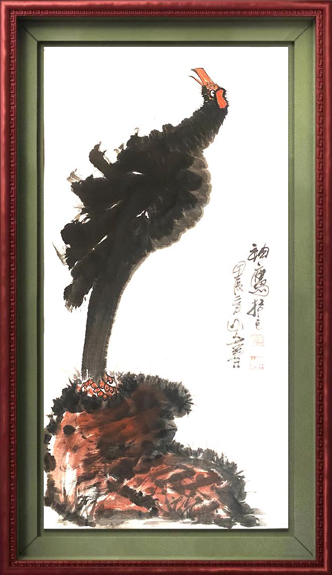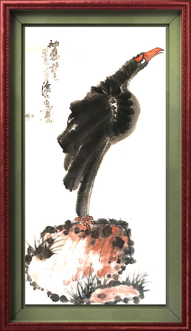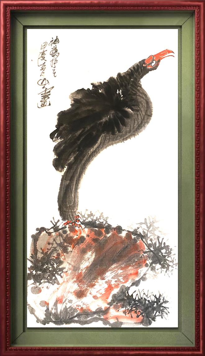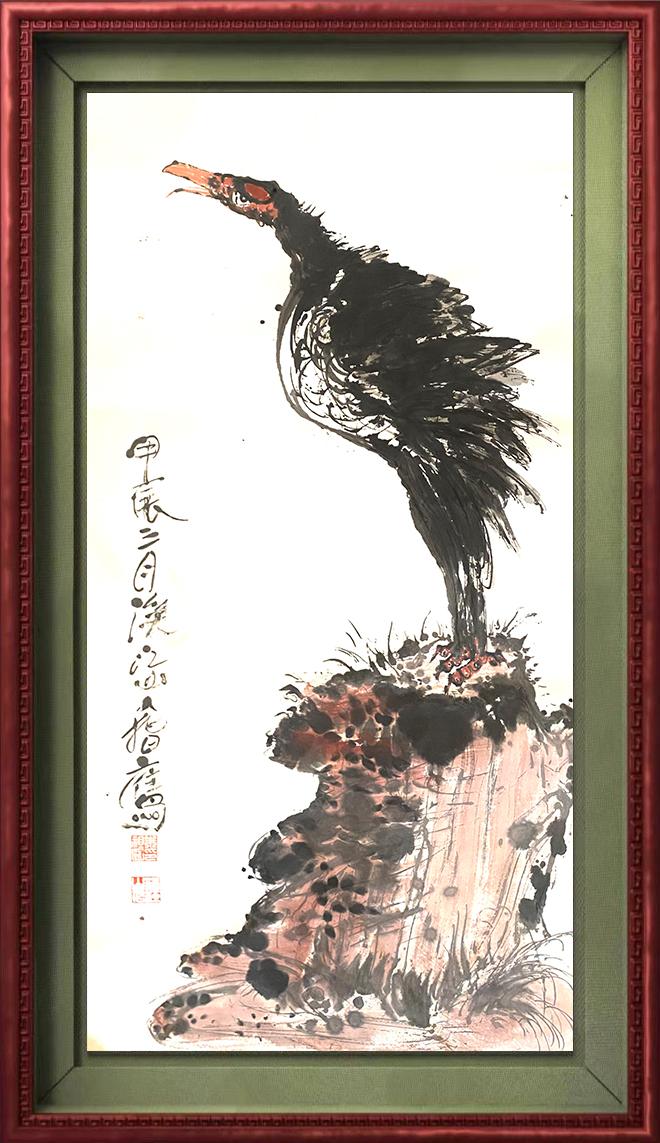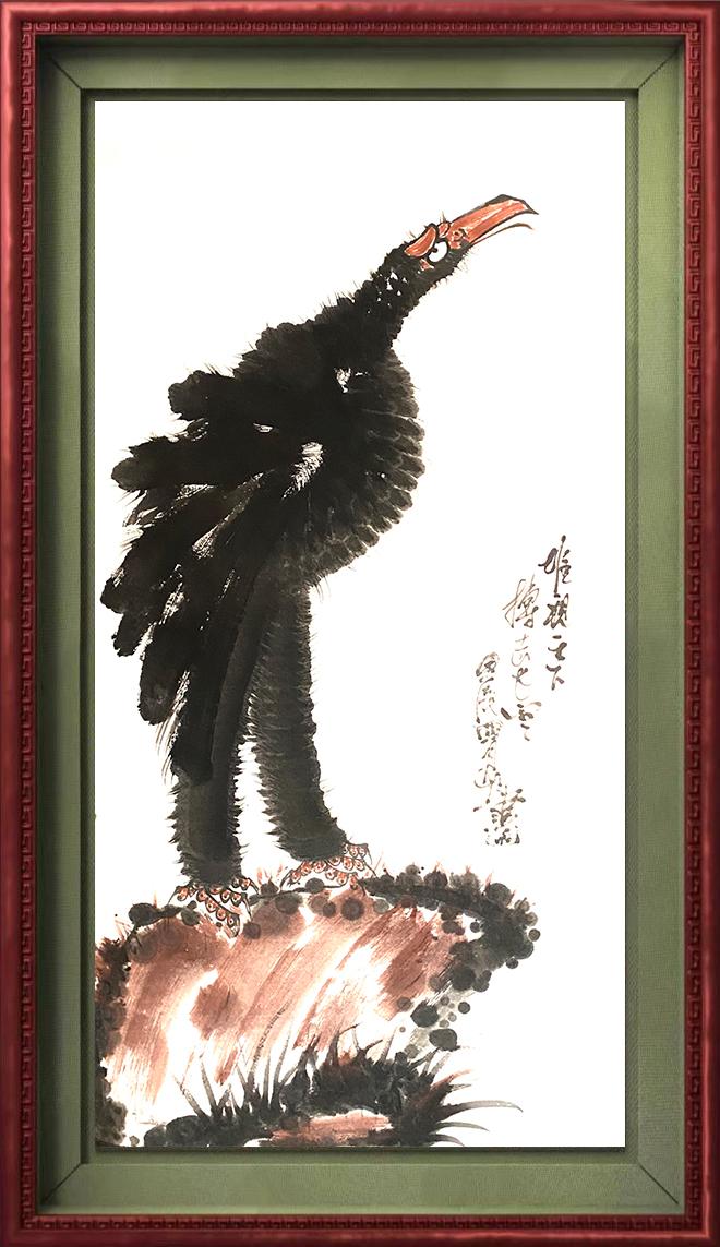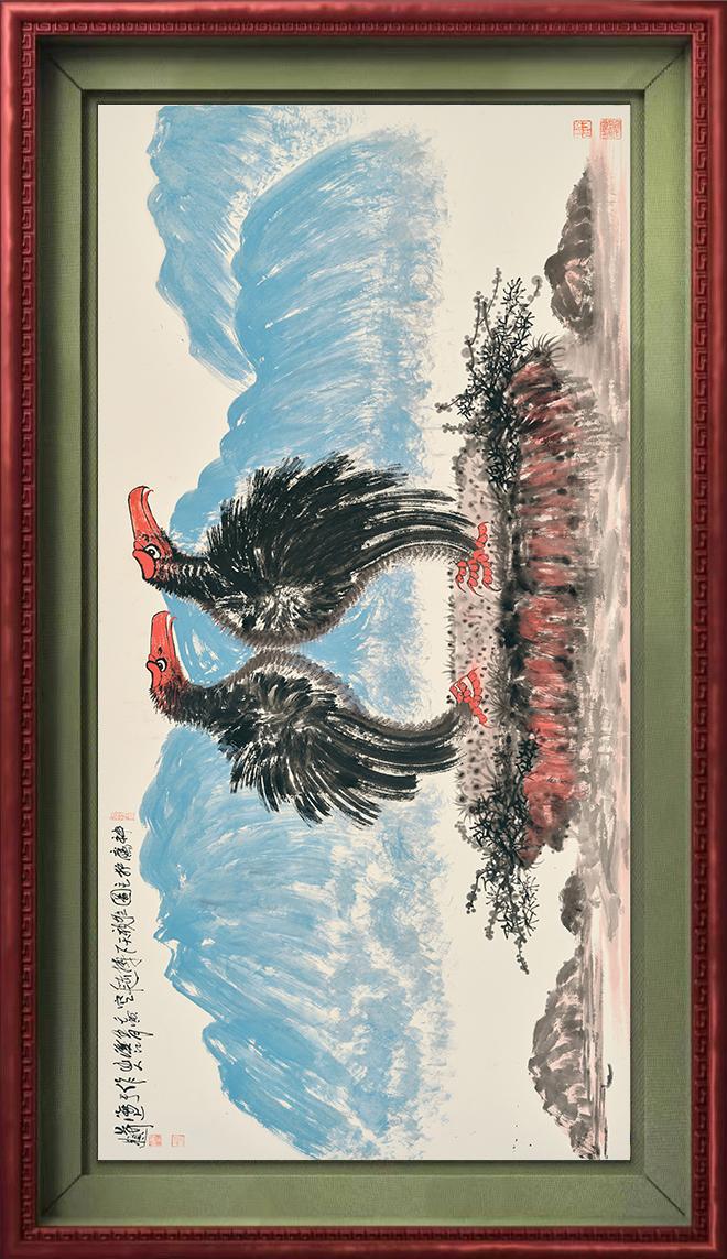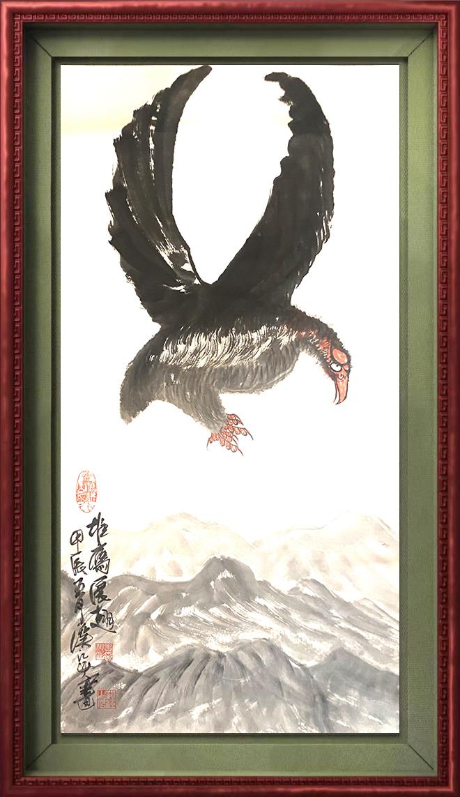 朱祖国笔下雄鹰不但形态健美,英姿勃发,气韵贯虹,而且在笔墨的枯湿浓淡和作画的宽阔胸襟中,脱去了鹰的凶气,融入了雅气,更显豪气、义气、文气。他以书法入画,再根据不同的画面配上自己创作的诗文,构成了风格鲜明,独具特色的雄鹰题材,在画坛独树一帜。