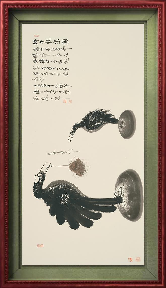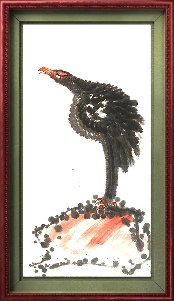 朱祖国画鹰重韵、重势。纵观其每一幅作品,他都以豪放不羁的笔调,巧妙的水墨运用,表现出鹰爪、嘴的锐利、钢健;翅膀的凝重、磅礴;身体的厚实、酣畅;尤为传神的是鹰的双眼,透露出精神昂扬,蓬勃生机,高瞻远瞩之感觉。