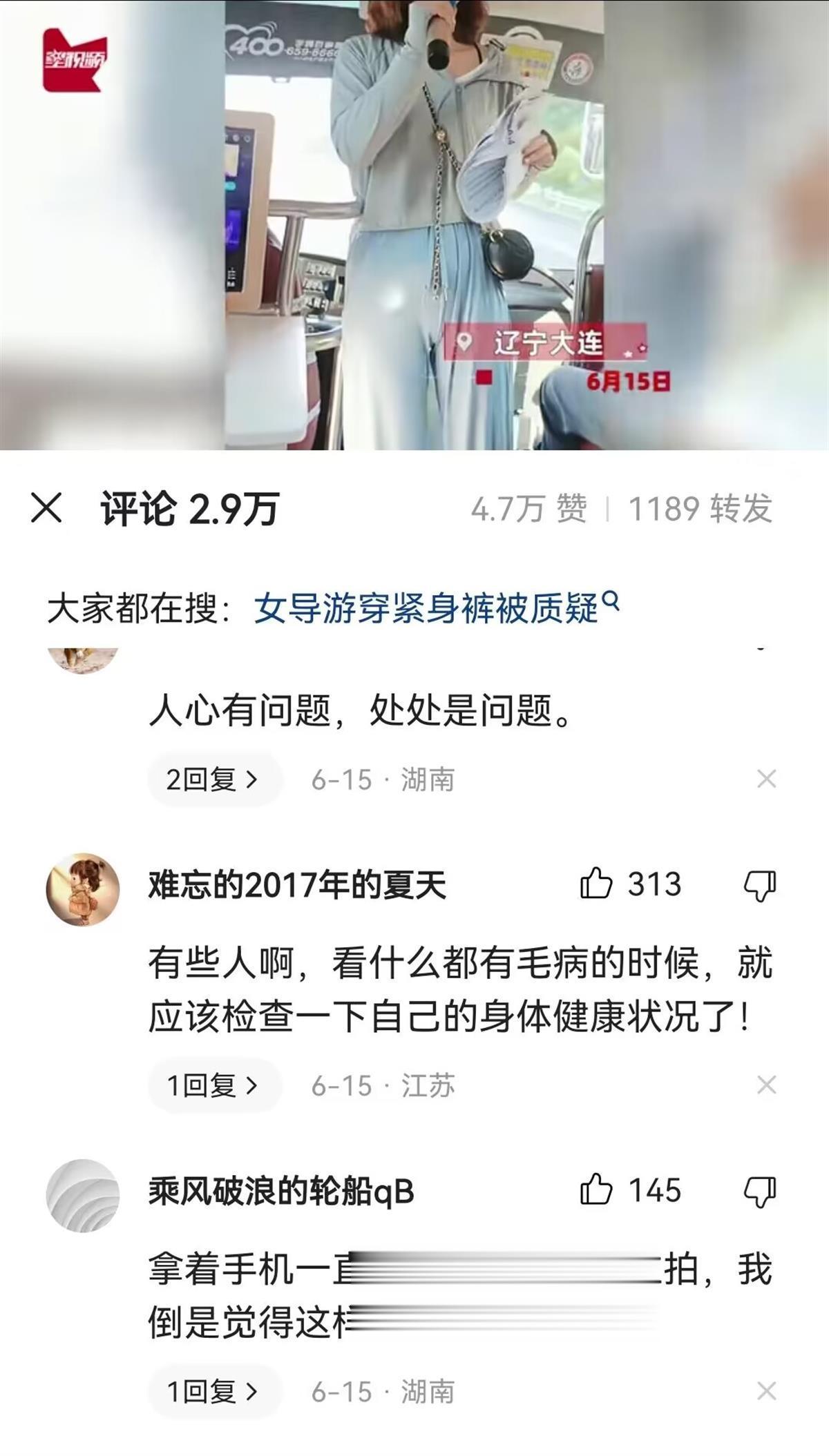 网友说,人家的穿着哪里错了?有什么不妥?质疑拍摄者坐在车上不好好听导游讲解,老盯着导游看,将人家下半身拍下来发到网上,给别人泼脏水,还一副正人君子的样子,说人家是“色情营销”,这样的人自己才是心理不健康。