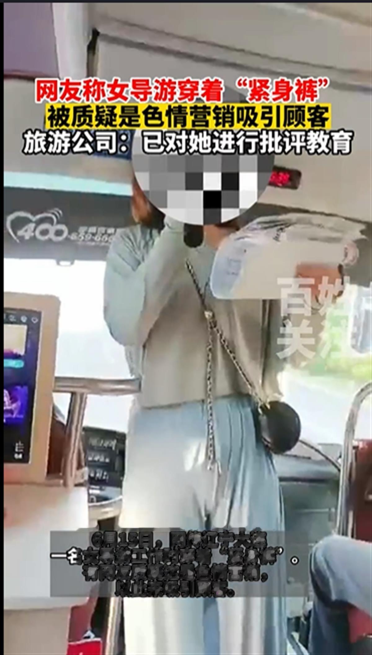6月15日,辽宁大连。一段女导游穿着“紧身裤”被质疑是色情营销的视频引起网友热议。视频显示,一名女导游穿着“紧身裤”给游客讲解。有网友质疑导游隐私部位外形露出,认为这是色情营销,以此来吸引顾客。对此,旅游公司工作人员称,目前视频已删除,导游不是黑导,是外雇的,已电话沟通对她进行了批评教育。(据6月15日中国网)