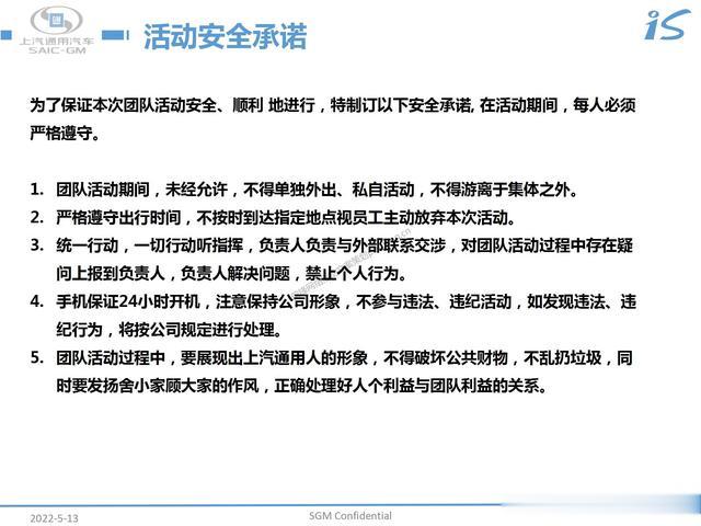 为了保证本次团队活动安全、顺利 地进行,特制订以下安全承诺, 在活动期间,每人必须严格遵守。①团队活动期间,未经允许,不得单独外出、私自活动,不得游离于集体之外。②严格遵守出行时间,不按时到达指定地点视员工主动放弃本次活动。③统一行动,一切行动听指挥,负责人负责与外部联系交涉,对团队活动过程中存在疑问上报到负责人,负责人解决问题,禁止个人行为。④手机保证24小时开机,注意保持公司形象,不参与违法、违纪活动,如发现违法、违纪行为,将按公司规定进行处理。⑤团队活动过程中,要展现出上汽通用人的形象,不得破坏公共财物,不乱扔垃圾,同时要发扬舍小家顾大家的作风,正确处理好人个利益与团队利益的关系。