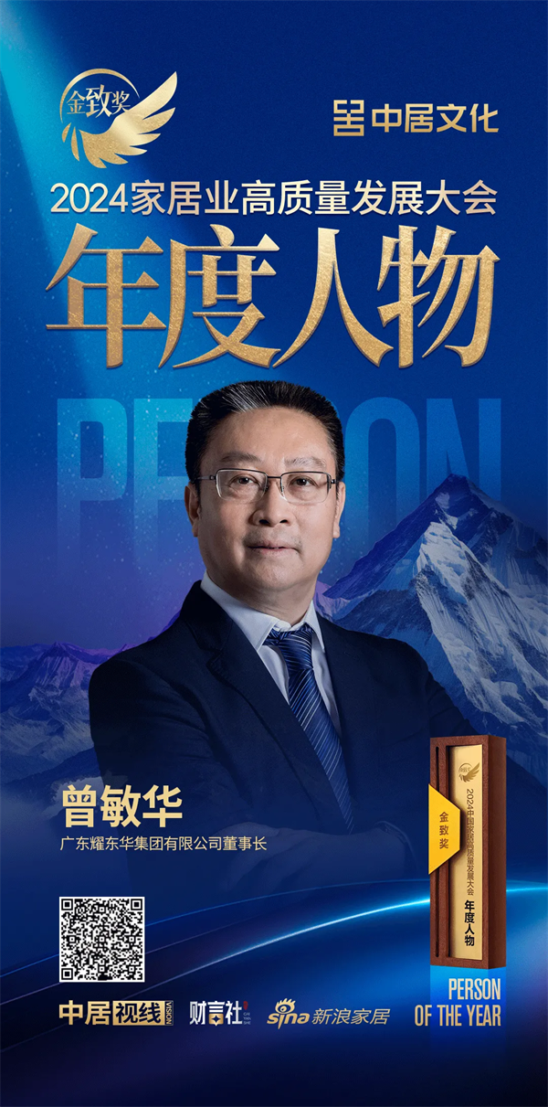 集团董事长曾敏华先生,凭借敏锐的洞察力、卓越的眼光、坚定的精神,引领企业披荆斩棘、勇攀高峰,为家居业的发展开拓出广阔道路,在大会同期举行的颁奖环节中,荣获了『“向开路青年”致敬』以及「金致奖2024年度人物」两项殊荣。
