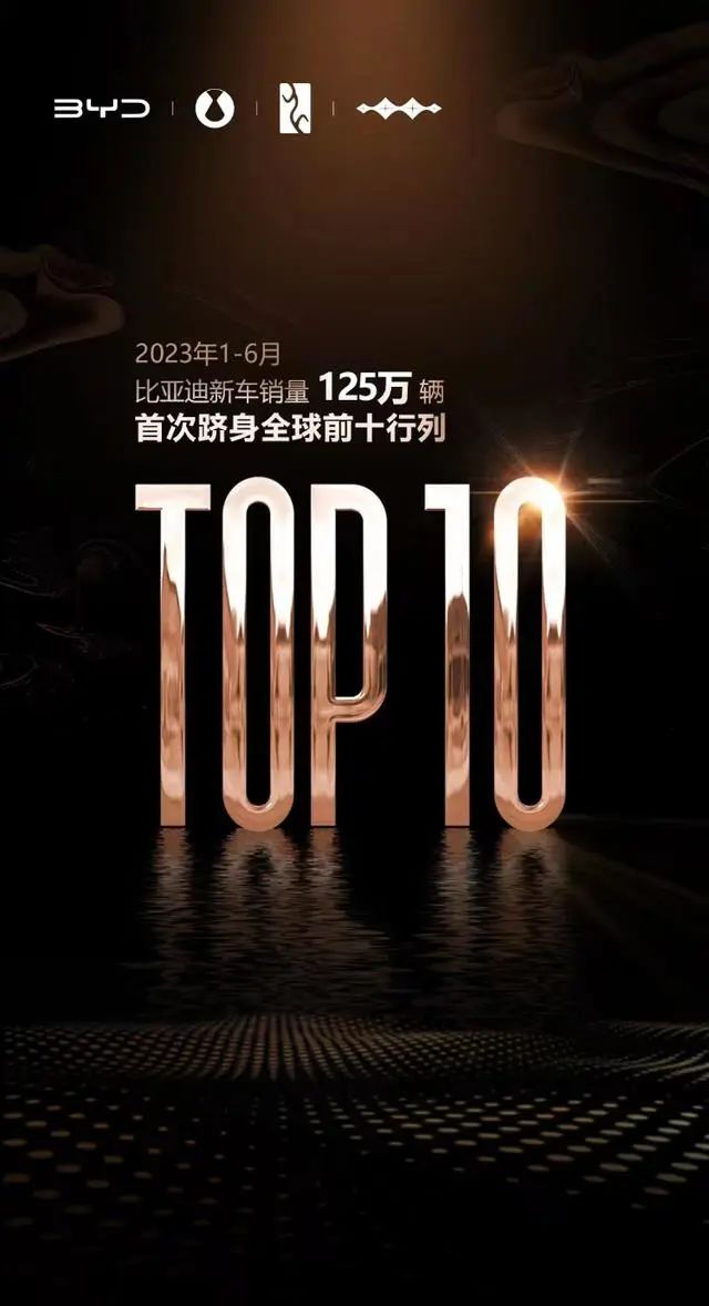 终于在2023年1~6月比亚迪旗下全球新车销量同比增长 96%至 125 万辆,超过德国梅赛德斯奔驰和德国宝马,正式跻身前10,这是中国汽车工业70年来的里程碑时刻。