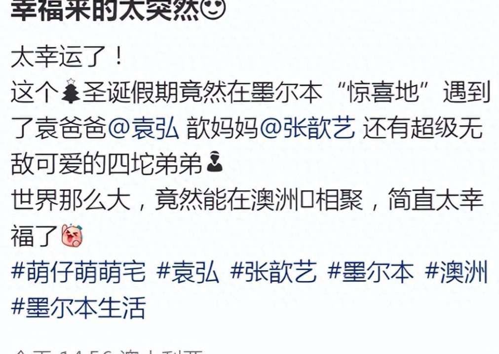 张歆艺和袁弘带着他们6岁的儿子四坨一起在澳洲墨尔本度假。这个小家庭的旅行不仅充满温馨,还迎来了一个有趣的偶遇——童星张梓墨。她在社交媒体上晒出了与他们的合照,并表示:“世界那么大,竟然能在澳洲相聚,简直太幸福了。”