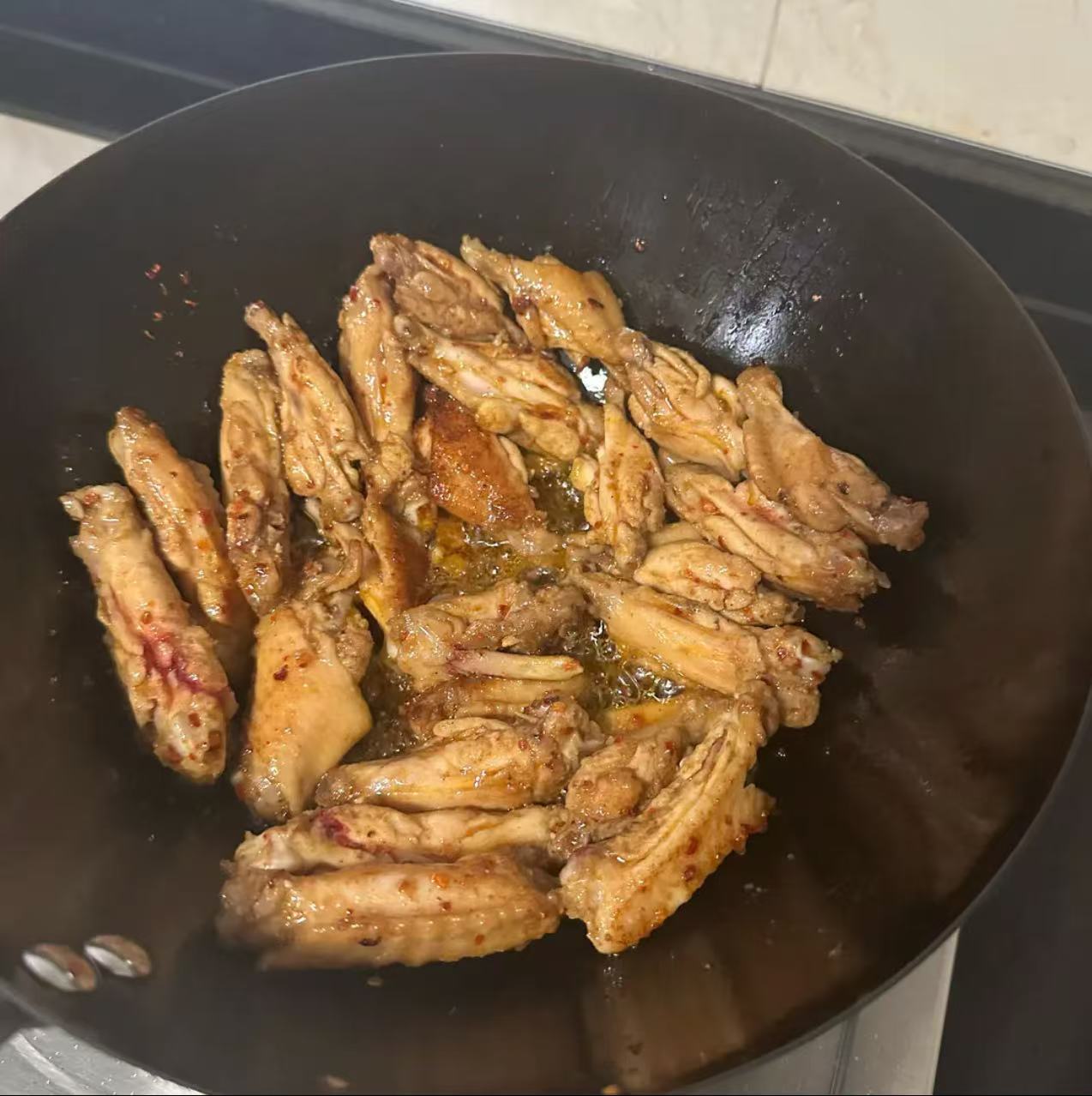 3. 炒鸡翅:将炸好的鸡翅重新入锅,加入豆瓣酱翻炒均匀,使每一块鸡翅都裹上酱色。