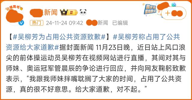 注意,吴柳芳道歉的原因不是“跳擦边舞蹈”,也不是“影响了体操的神圣性”,而是“耽搁了大家的时间”。这个道歉不可谓不巧妙,既体现了自己的谦逊有礼,又表明了“跳舞无错”的态度。