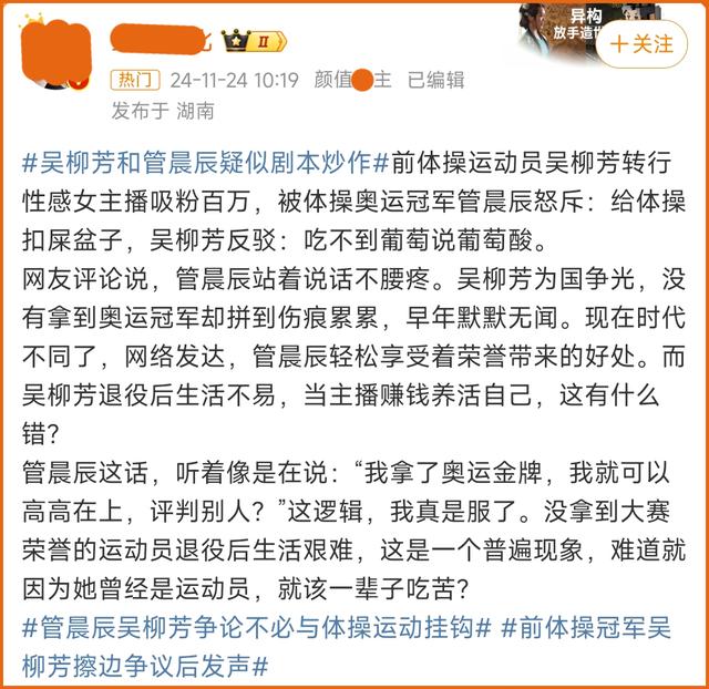 11月22日,管晨辰在吴柳芳的视频下方发布了一条批评性质的评论:你要擦(边)就擦你的,不要给体操扣屎盆子了,你的正能量体操好像不需要。