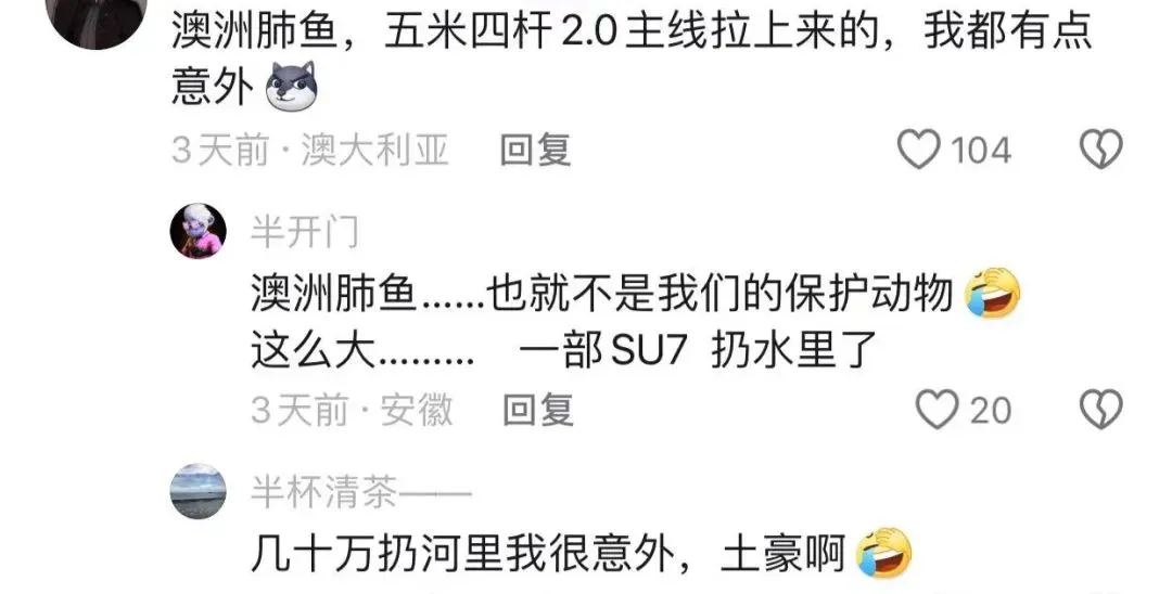 博主分享用什么线组钓的以后,就有网友在下边回复!这么大,一部su7,扔水里了!还有网友说:几十万扔河里,我很意外土豪!该说不说,博主看到估计泪流满面!