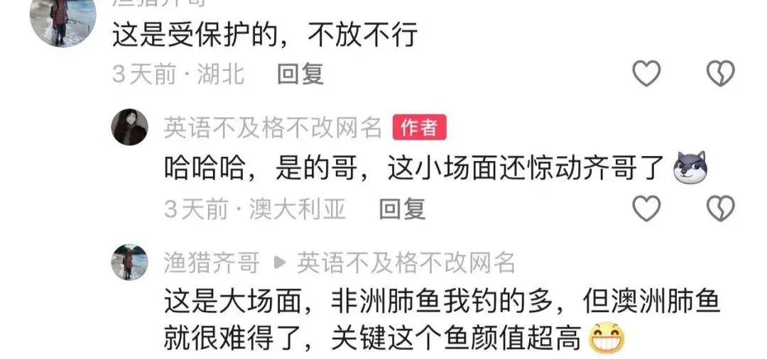 网友齐哥:这是受保护的,不妨不行!看来呀,这种鱼应该在澳大利亚,也是受到法律保护的!所以,博主必须要放生的!