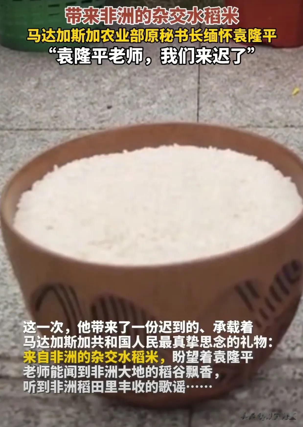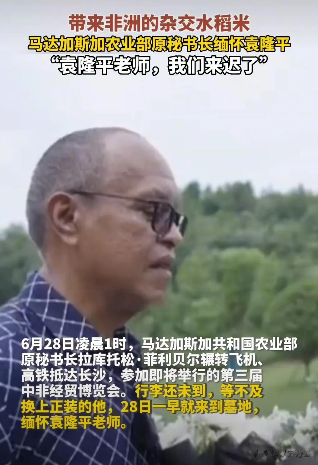 6月28日,一个非洲老人端着一碗米来到袁隆平老爷子的墓前,沉痛地说:袁隆平老师,我们来迟了…… 这名非洲人是非洲岛国马达加斯加农业部原秘书长,名叫拉库托松·菲利贝尔。 他这次是来中国参加第三届中非经贸博览会的,他一下飞机就专门坐动车来到长沙袁老爷子墓地,代表马达加斯加缅怀袁隆平老师。 其实袁老爷子一生都没有去过马达加斯加,只不过在2006年首届中非领导人论坛上,中国承诺在非洲建立十个特色农业技术示范中心,其中就包括了在马达加斯加的杂交水稻示范中心。 当时袁老委派方志辉、杨耀松、胡月舫等科学家前往马达加斯加帮助当地种植杂交水稻。 在中马专家的共同努力下,经过十多年的培育努力,目前,中国杂交水稻在马达加斯加累计推广面积已达5万多公顷,平均每公顷产量可达7.5吨左右。马达加斯加距离实现粮食自给自足的目标迈近了一大步。 马达加斯加为了感谢中国的援助,在他们面值最大的纸币上专门绘制了一株杂交水稻。 目前,20多个非洲国家在种植杂交水稻,中国还持续向有需要的国家和地区提供农业技术支持,帮助各国加强杂交水稻相关农业能力建设。 发展杂交水稻,造福世界人民!袁隆平老爷子千古!