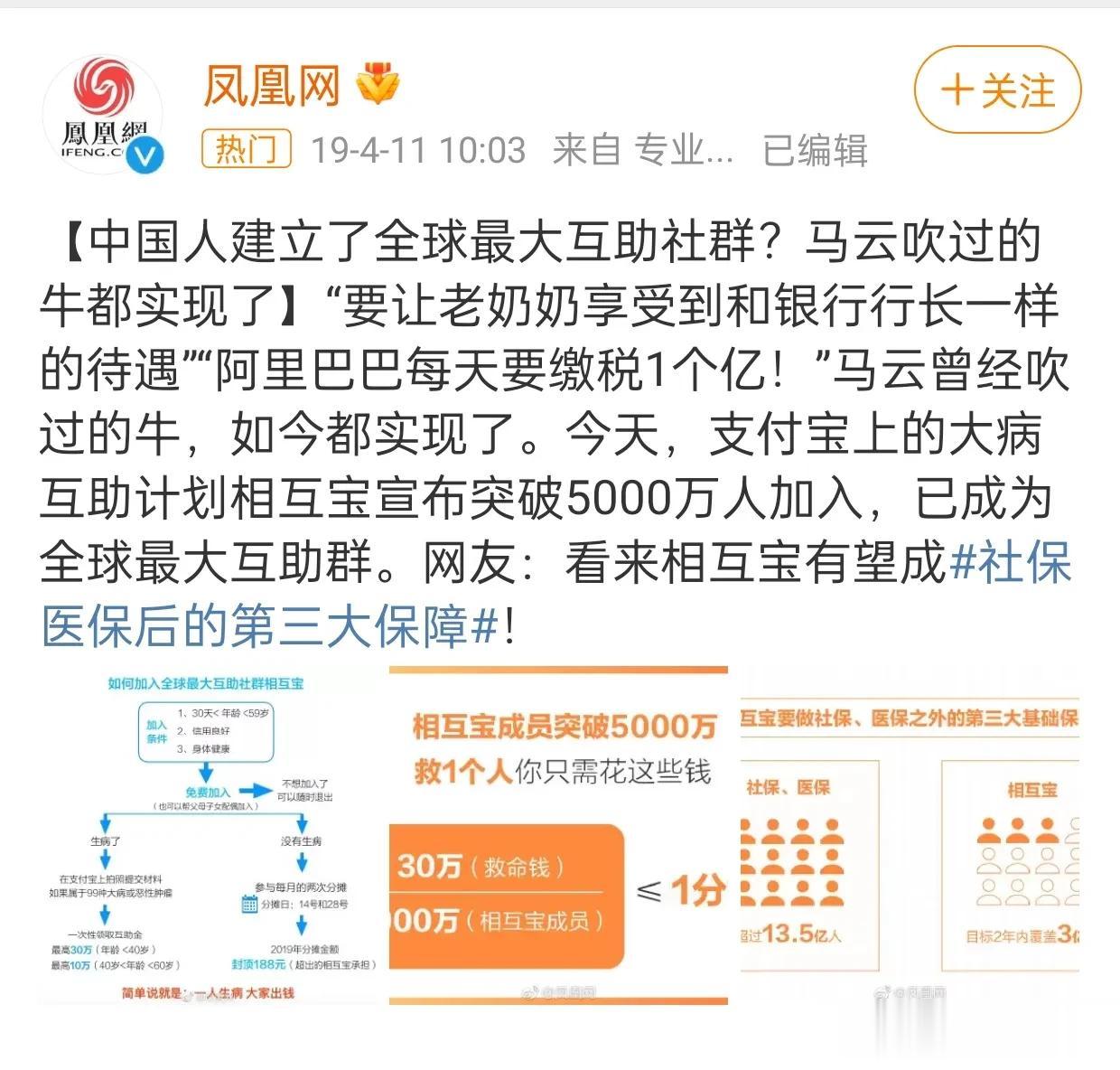 蚂蚁集团被罚71.23亿元,看了这个新闻,蚂蚁的问题应该出在“相互宝”这个业务上。 搜一下“相互宝”的关键词,回过头再看一些媒体的报道和网友的真实评价对比,真的很有意思 “马云吹过的牛都实现了”、“相互宝有望称为社保、医保后的第三大保障”……现在看看媒体这些话语,羞不羞?