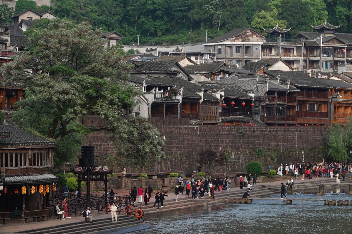 茶峒河街更是充满了诗意与风情。沿江而建的吊脚楼,错落有致地分布在小桥流水之间,墙壁上还点缀着沈从文的诗句。漫步其间,触景生情,恍惚间真的觉得自己走在翠翠的边城故事里,每一步都仿佛能听到翠翠和爷爷的欢声笑语。