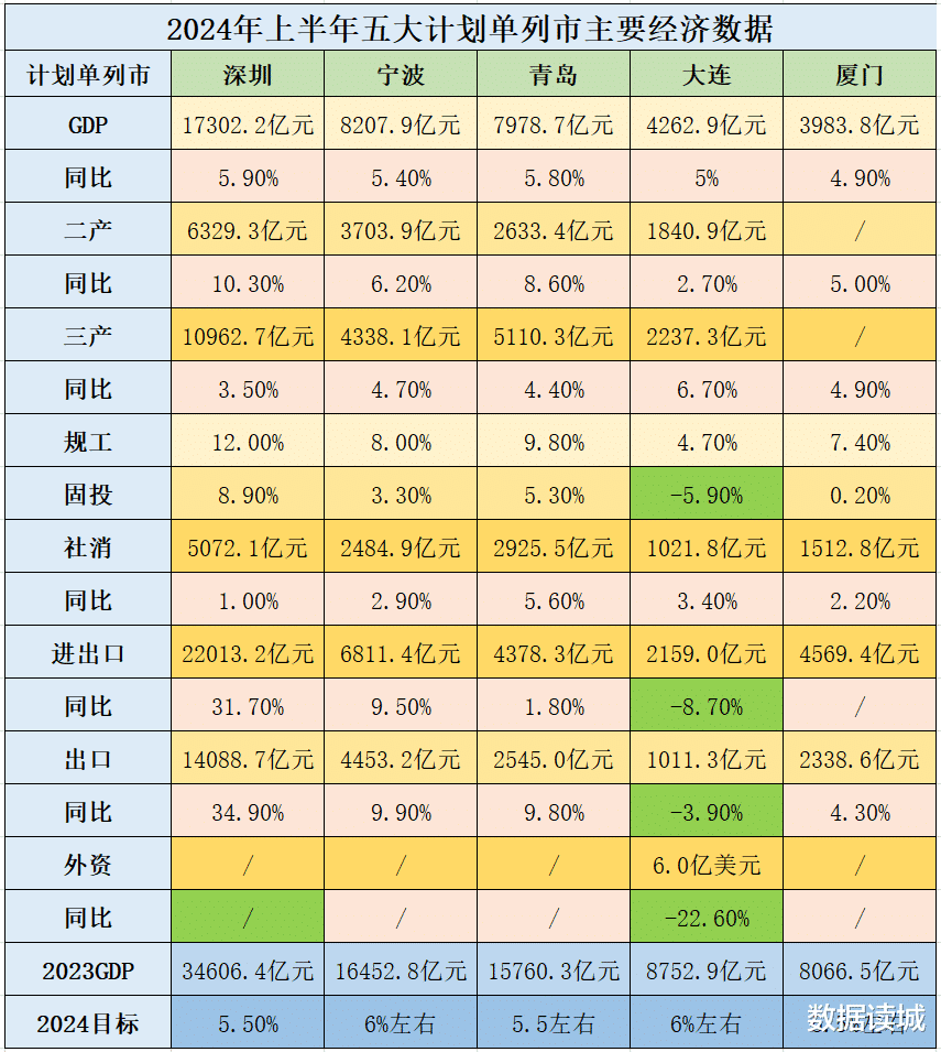 五大计划单列市年初各自拟定的2024年度发展目标基本在5.5至6%左右,半年报上深圳、青岛略高于目标增速,宁波、大连和厦门则略低于目标增速,需要尽快在第3季度回正,从而确保如期实现全年指标。