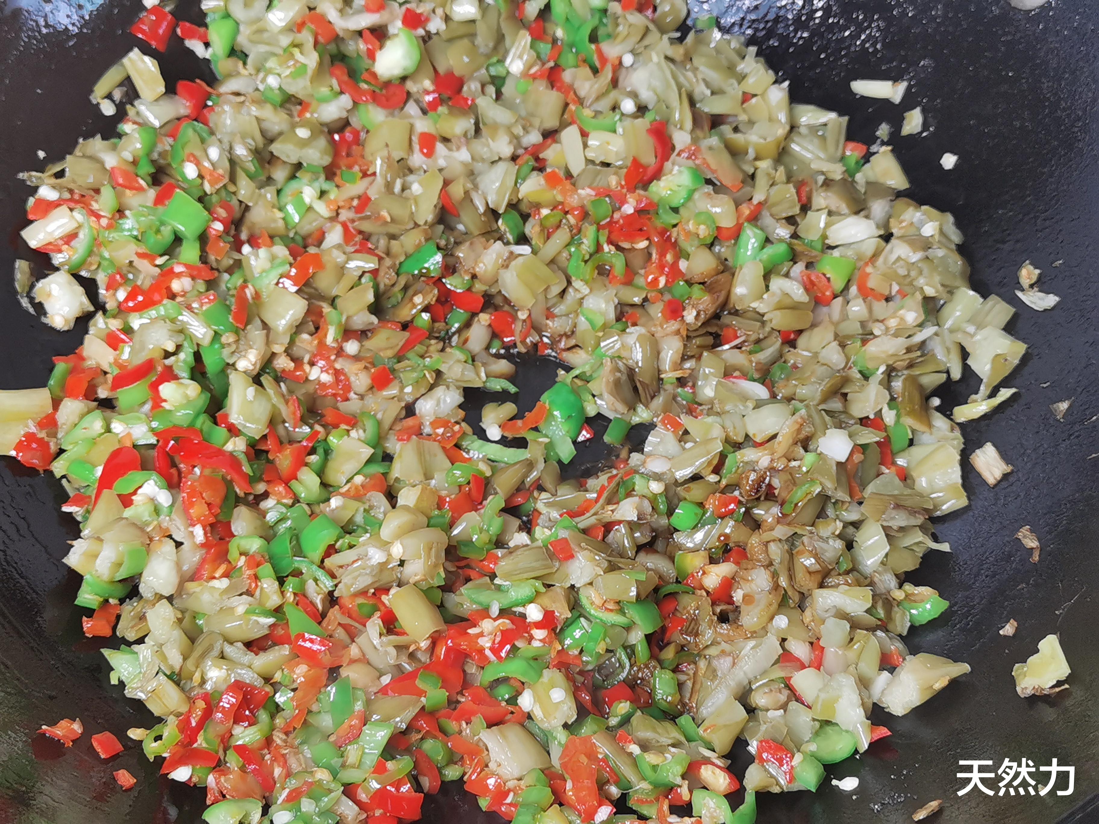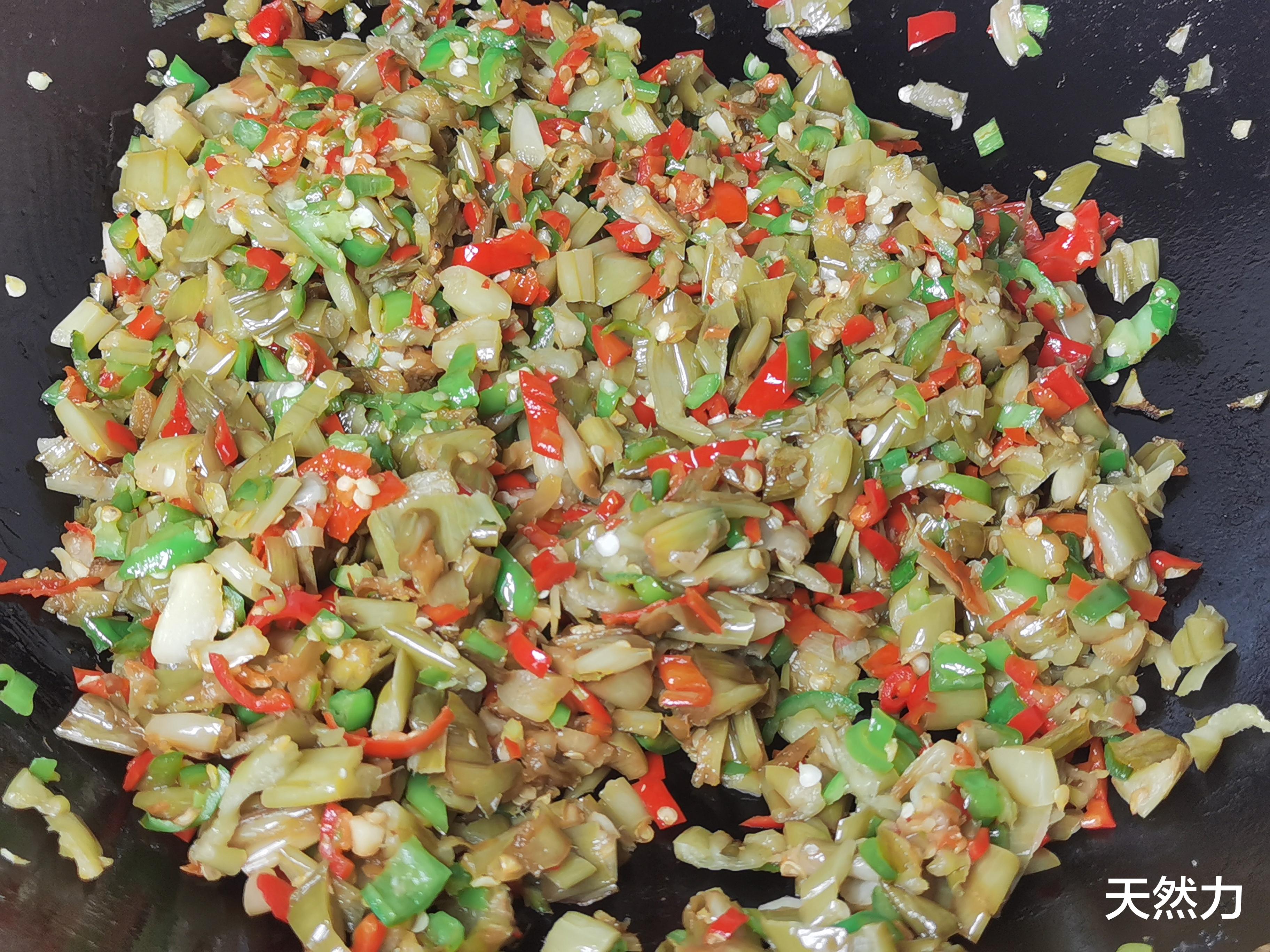 因为洗过的原因,芋荷里还含有水,所以必须把芋荷炒干些,这样的芋荷吃起来那酸味才纯粹,才会有那种带着香气的酸味,才是我们要的味道。