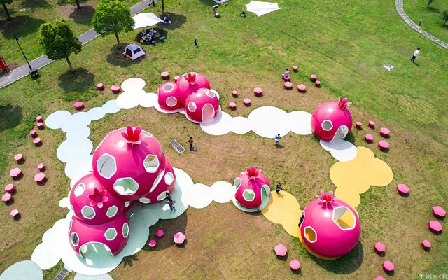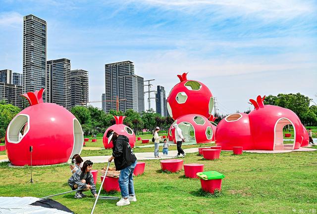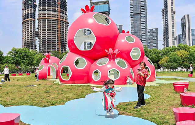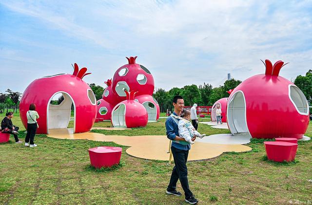 5月2日,武汉阳光明媚,大批市民游客涌入汉口江滩四期游玩,草坪上一组“红石榴”造型的雕塑吸引不少游人来打卡。该雕塑于去年底建成,由大小不一的11个“红石榴”组成,雕塑最高处约8米。(湖北日报全媒记者朱熙勇摄)