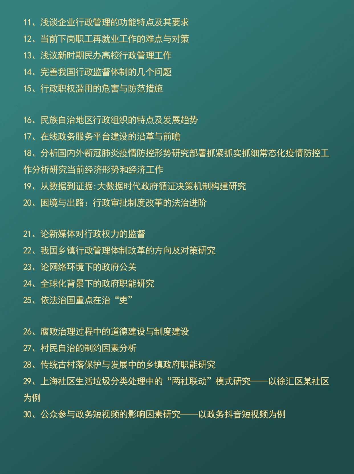 行政管理是运用国家权力对社会事务以及自身内部进行管理的一种活动,它包含经济建设、文化教育、市政建设、社会秩序、公共卫生、环境保护等各个方面,行政管理专业的毕业论文可以围绕上述内容写。 在结合专业内容的同时,也要结合社会热点,行政管理里相关热点搜索词有:目标管理、行政机关、行政主体、组织管理、行政管理体制改革、电子政务、绩效管理、人事管理、财政管理、危机管理等。