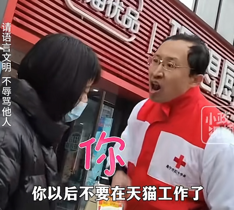 一旁好似还有和他一同的工作人员,他用手指着工作人员,歇斯底里怒吼:“还有你,今天好好认清你的责任,你以后不要在天猫工作了”